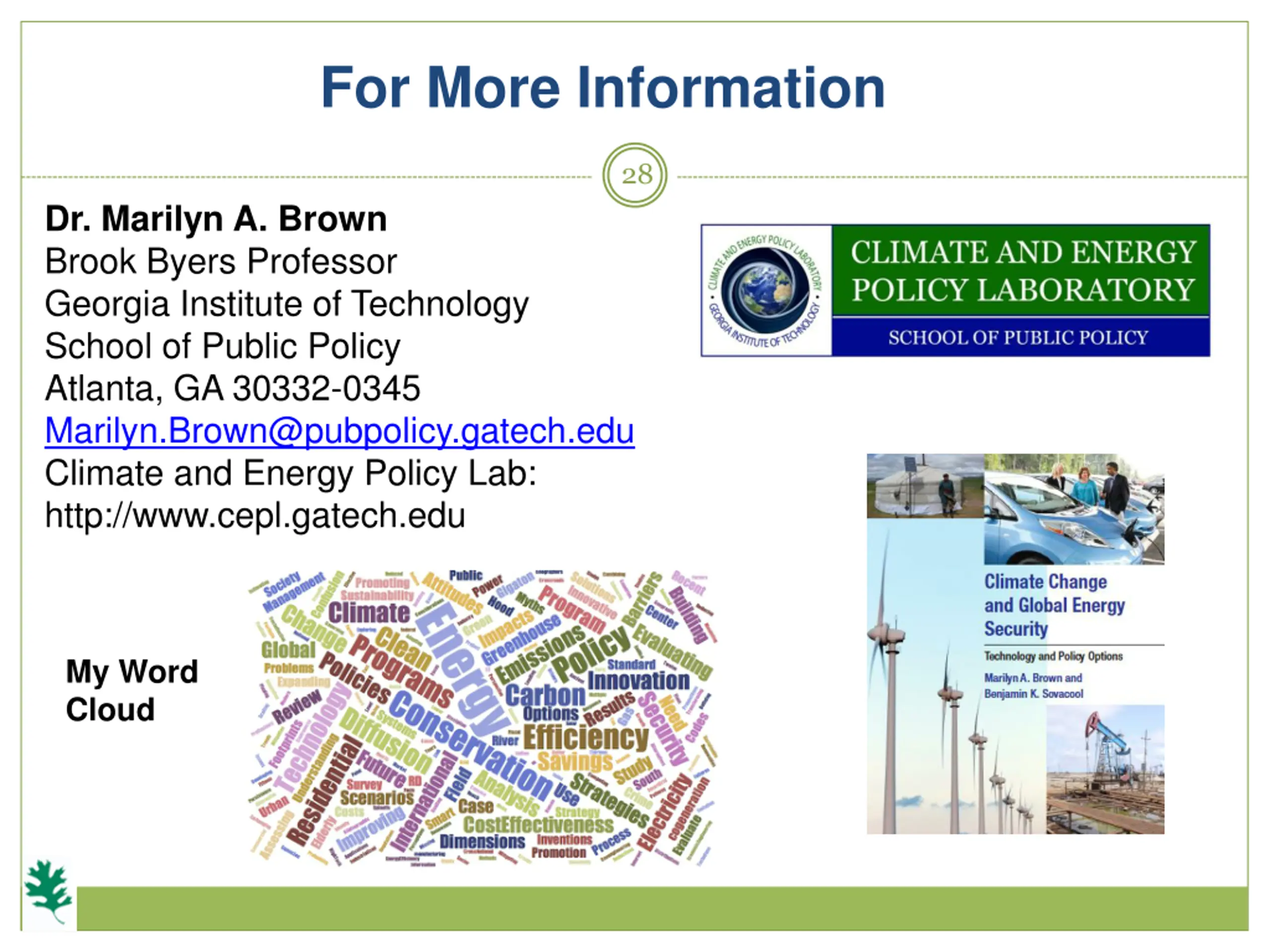 For More Information 28 Dr. Marilyn A. Brown Brook Byers Professor Georgia Institute of Technology School of Public Policy Atlanta, GA 30332-0345 Marilyn.Brown@pubpolicy.gatech.edu Climate and Energy Policy Lab: http://www.cepl.gatech.edu My Word Cloud