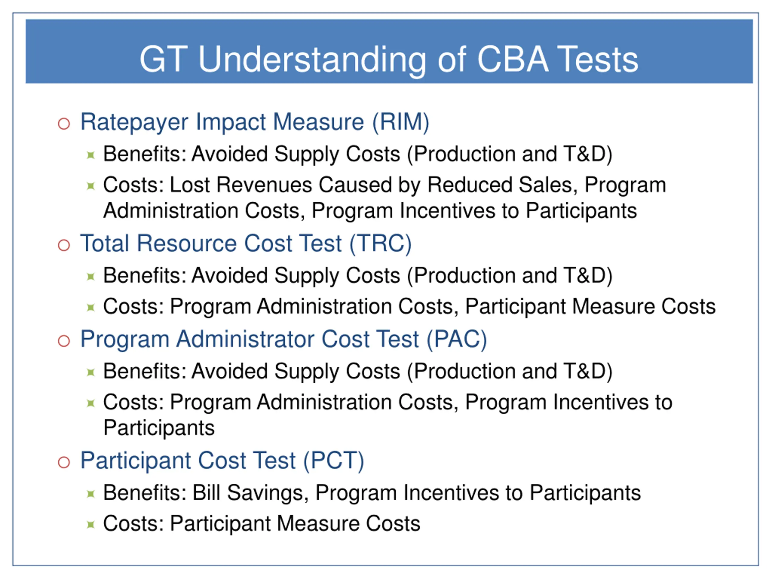 GT Understanding of CBA Tests Ratepayer Impact Measure (RIM) Benefits: Avoided Supply Costs (Production and T&D) Costs: Lost Revenues Caused by Reduced Sales, Program Administration Costs, Program Incentives to Participants Total Resource Cost Test (TRC) Benefits: Avoided Supply Costs (Production and T&D) Costs: Program Administration Costs, Participant Measure Costs Program Administrator Cost Test (PAC) Benefits: Avoided Supply Costs (Production and T&D) Costs: Program Administration Costs, Program Incentives to Participants Participant Cost Test (PCT) Benefits: Bill Savings, Program Incentives to Participants Costs: Participant Measure Costs