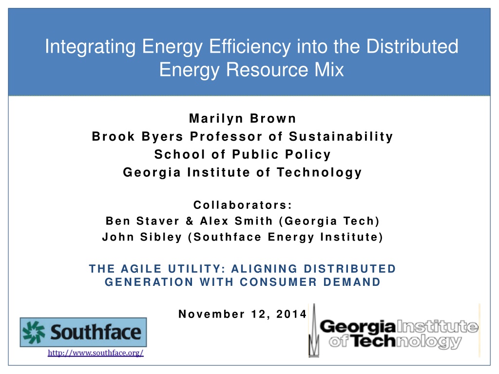 Integrating Energy Efficiency into the Distributed Energy Resource Mix Marilyn Brown Brook Byers Professor of Sustainability School of Public Policy Georgia Institute of Technology Collaborators: Ben Staver & Alex Smith (Georgia Tech) John Sibley (Southface Energy Institute) THE AGILE UTILITY: ALIGNING DISTRIBUTED GENERATION WITH CONSUMER DEMAND November 12, 2014