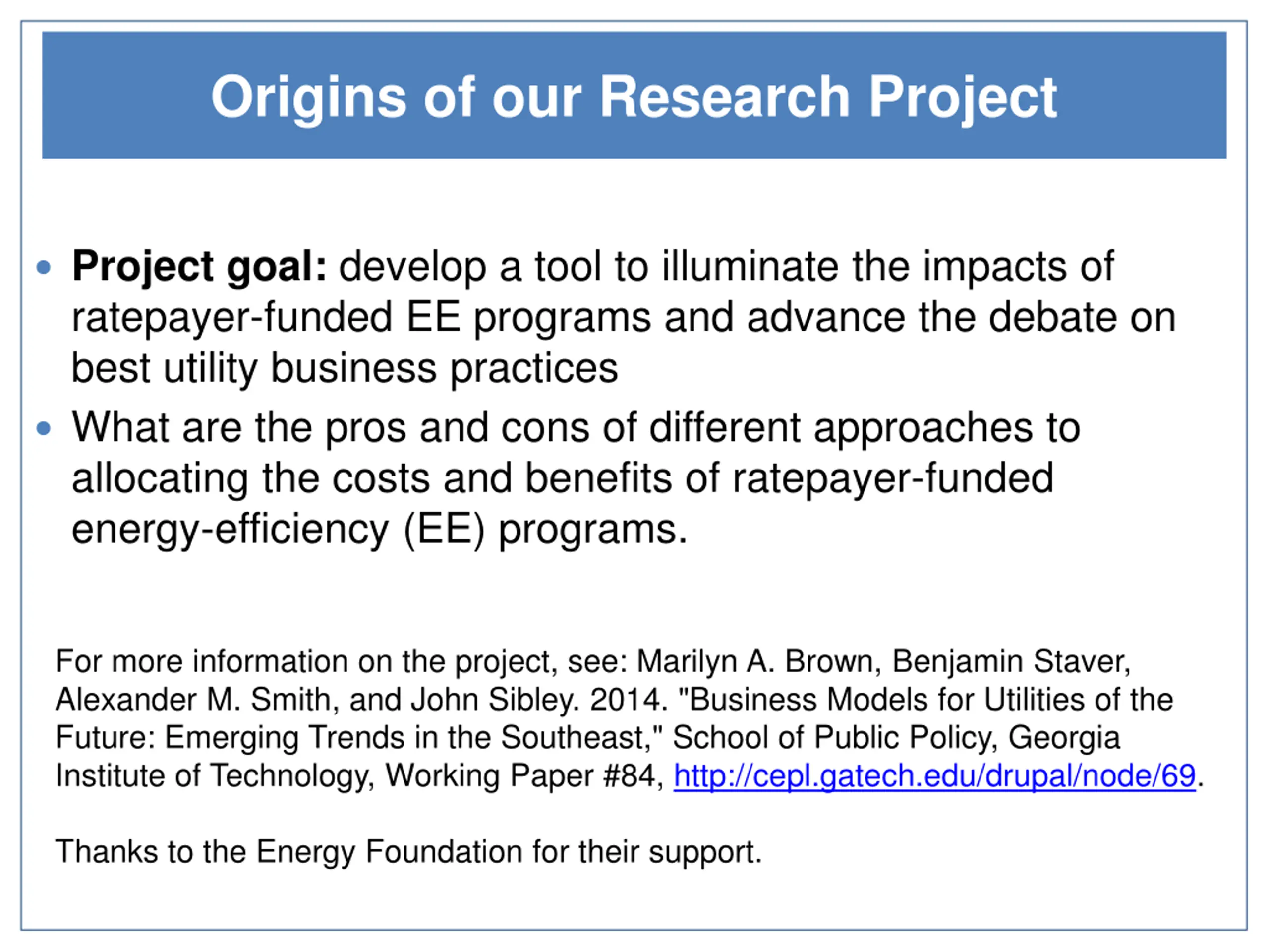 Origins of our Research Project Project goal: develop a tool to illuminate the impacts of ratepayer-funded EE programs and advance the debate on best utility business practices What are the pros and cons of different approaches to allocating the costs and benefits of ratepayer-funded energy-efficiency (EE) programs. For more information on the project, see: Marilyn A. Brown, Benjamin Staver, Alexander M. Smith, and John Sibley. 2014. "Business Models for Utilities of the Future: Emerging Trends in the Southeast," School of Public Policy, Georgia Institute of Technology, Working Paper #84, http://cepl.gatech.edu/drupal/node/69. Thanks to the Energy Foundation for their support.