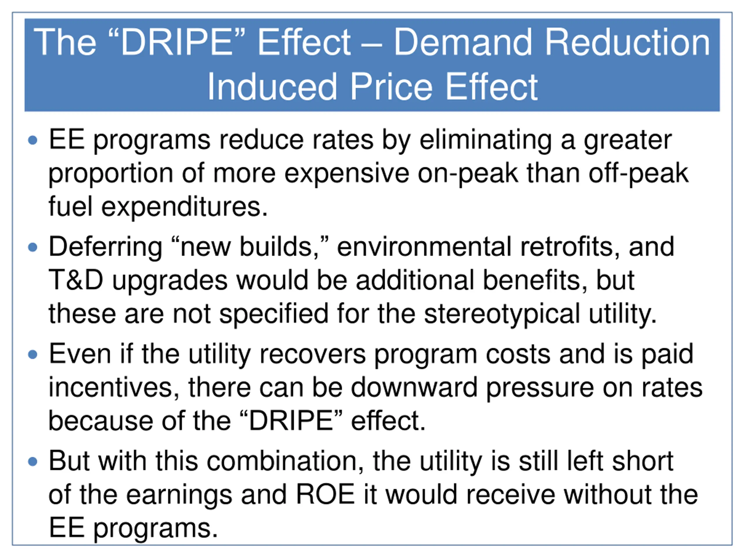 The DRIPE Effect Demand Reduction Induced Price Effect EE programs reduce rates by eliminating a greater proportion of more expensive on-peak than off-peak fuel expenditures. Deferring new builds, environmental retrofits, and T&D upgrades would be additional benefits, but these are not specified for the stereotypical utility. Even if the utility recovers program costs and is paid incentives, there can be downward pressure on rates because of the DRIPE effect. But with this combination, the utility is still left short of the earnings and ROE it would receive without the EE programs.