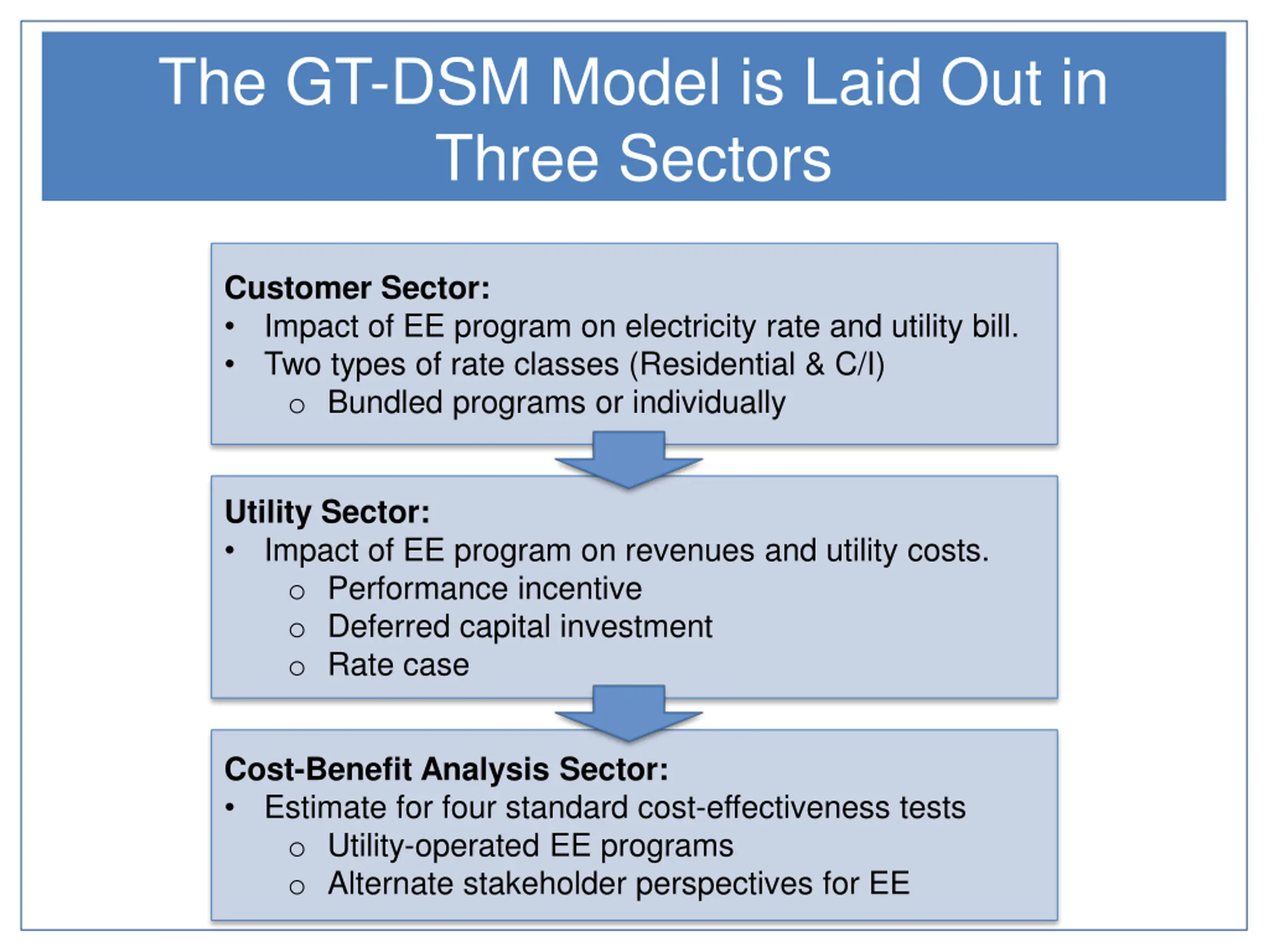 The GT-DSM Model is Laid Out in Three Sectors Customer Sector: Impact of EE program on electricity rate and utility bill. Two types of rate classes (Residential & C/I) o Bundled programs or individually Utility Sector: Impact of EE program on revenues and utility costs. o Performance incentive o Deferred capital investment o Rate case Cost-Benefit Analysis Sector: Estimate for four standard cost-effectiveness tests o Utility-operated EE programs o Alternate stakeholder perspectives for EE