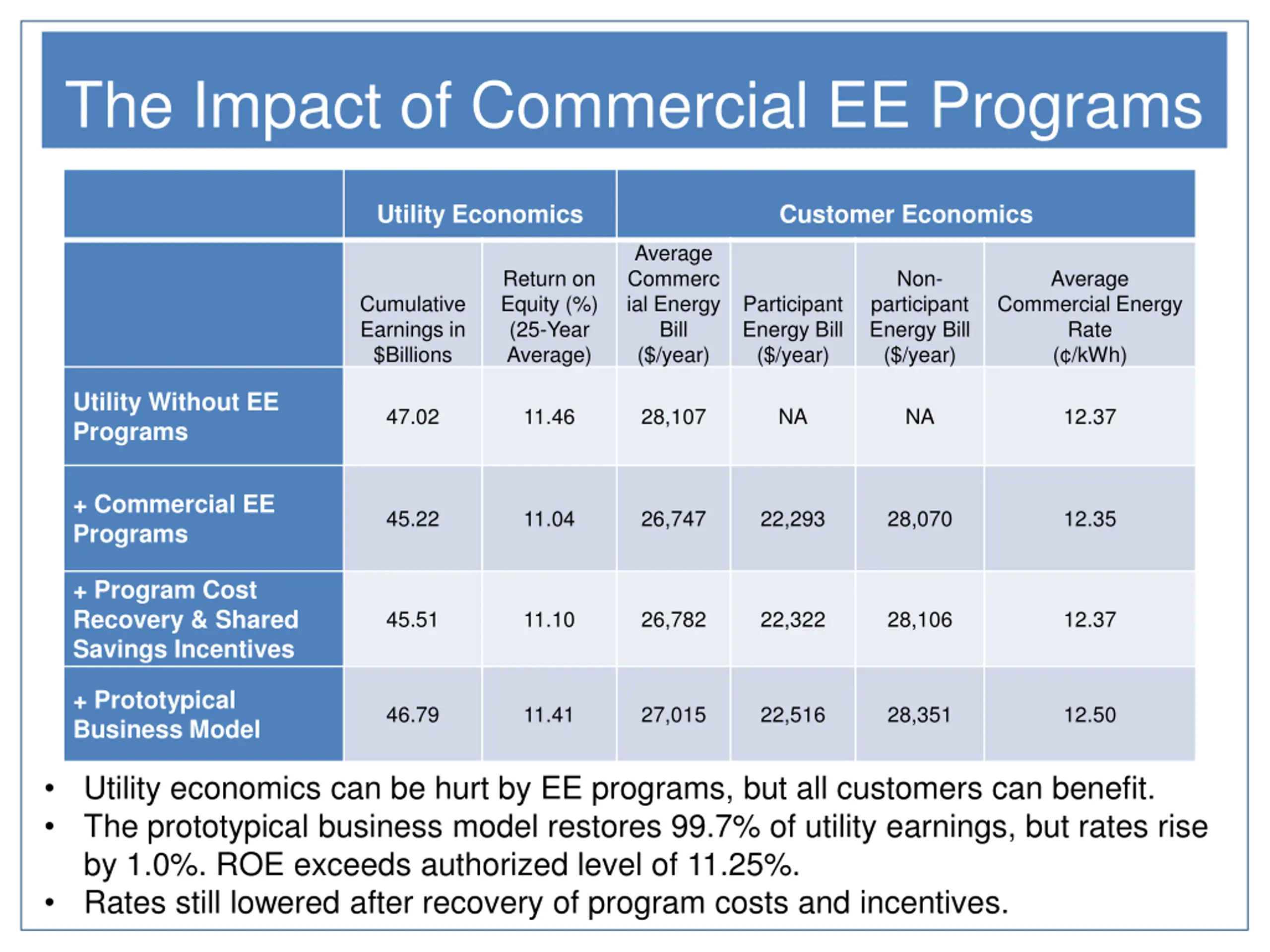 The Impact of Commercial EE Programs Utility Economics Customer Economics Average Commerc ial Energy Bill ($/year) Return on Equity (%) (25-Year Average) Non- Average Cumulative Earnings in $Billions Participant Energy Bill ($/year) participant Energy Bill ($/year) Commercial Energy Rate ( /kWh) Utility Without EE Programs 47.02 11.46 28,107 NA NA 12.37 + Commercial EE Programs 45.22 11.04 26,747 22,293 28,070 12.35 + Program Cost Recovery & Shared Savings Incentives 45.51 11.10 26,782 22,322 28,106 12.37 + Prototypical Business Model 46.79 11.41 27,015 22,516 28,351 12.50 Utility economics can be hurt by EE programs, but all customers can benefit. The prototypical business model restores 99.7% of utility earnings, but rates rise by 1.0%. ROE exceeds authorized level of 11.25%. Rates still lowered after recovery of program costs and incentives.
