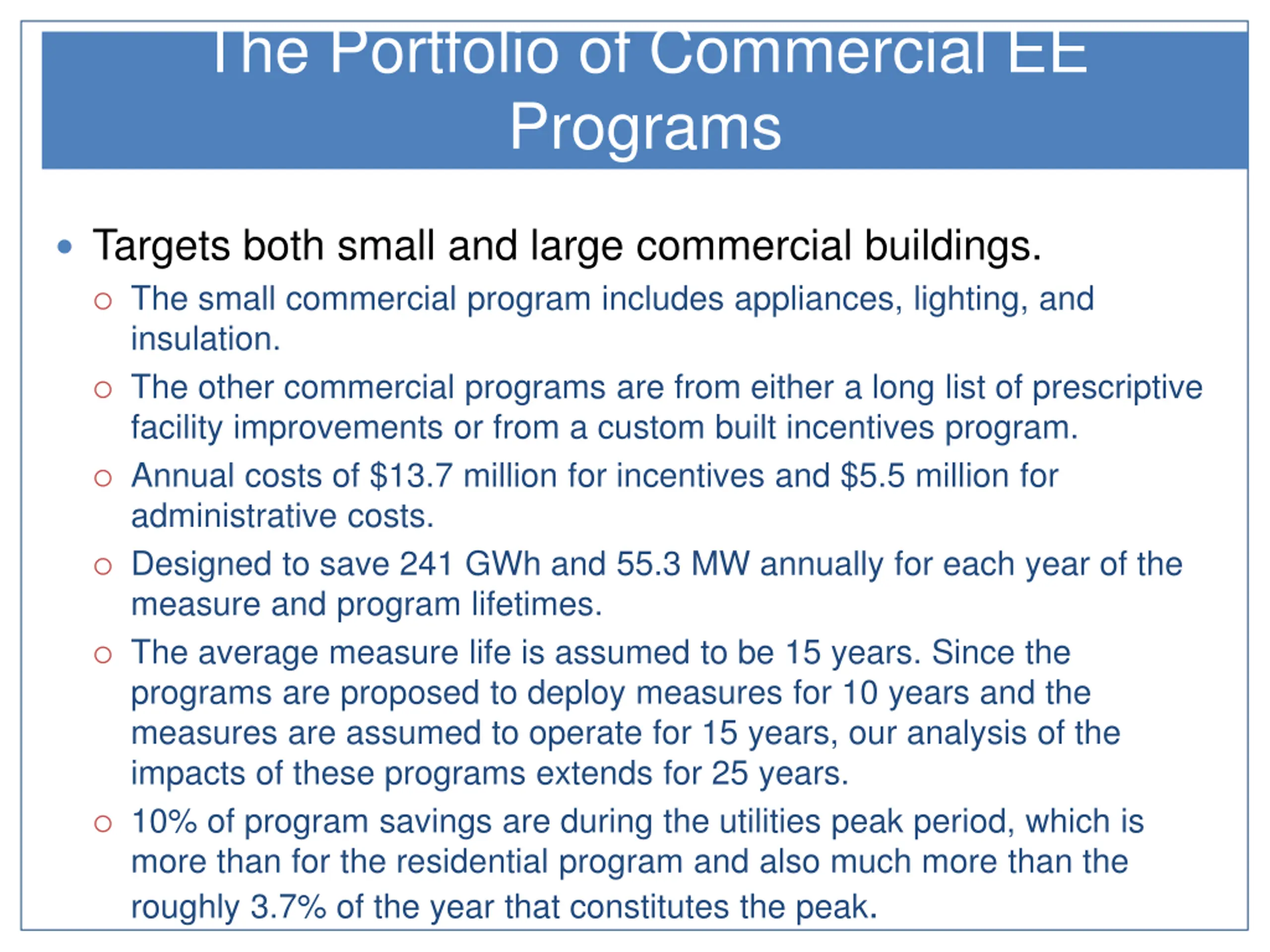 The Portfolio of Commercial EE Programs Targets both small and large commercial buildings. The small commercial program includes appliances, lighting, and insulation. The other commercial programs are from either a long list of prescriptive facility improvements or from a custom built incentives program. Annual costs of $13.7 million for incentives and $5.5 million for administrative costs. Designed to save 241 GWh and 55.3 MW annually for each year of the measure and program lifetimes. The average measure life is assumed to be 15 years. Since the programs are proposed to deploy measures for 10 years and the measures are assumed to operate for 15 years, our analysis of the impacts of these programs extends for 25 years. 10% of program savings are during the utilities peak period, which is more than for the residential program and also much more than the roughly 3.7% of the year that constitutes the peak.