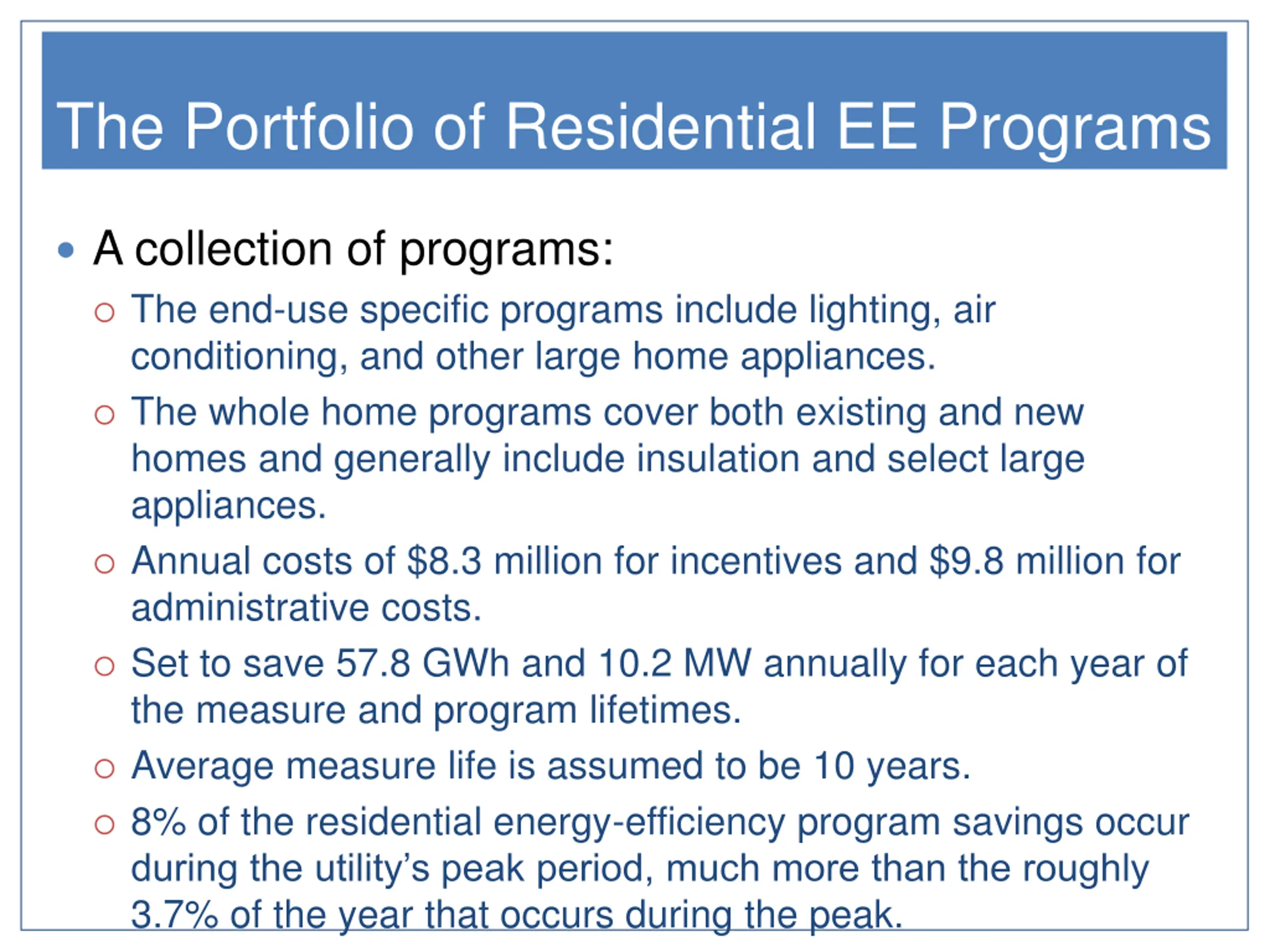 The Portfolio of Residential EE Programs A collection of programs: The end-use specific programs include lighting, air conditioning, and other large home appliances. The whole home programs cover both existing and new homes and generally include insulation and select large appliances. Annual costs of $8.3 million for incentives and $9.8 million for administrative costs. Set to save 57.8 GWh and 10.2 MW annually for each year of the measure and program lifetimes. Average measure life is assumed to be 10 years. 8% of the residential energy-efficiency program savings occur during the utility s peak period, much more than the roughly 3.7% of the year that occurs during the peak.