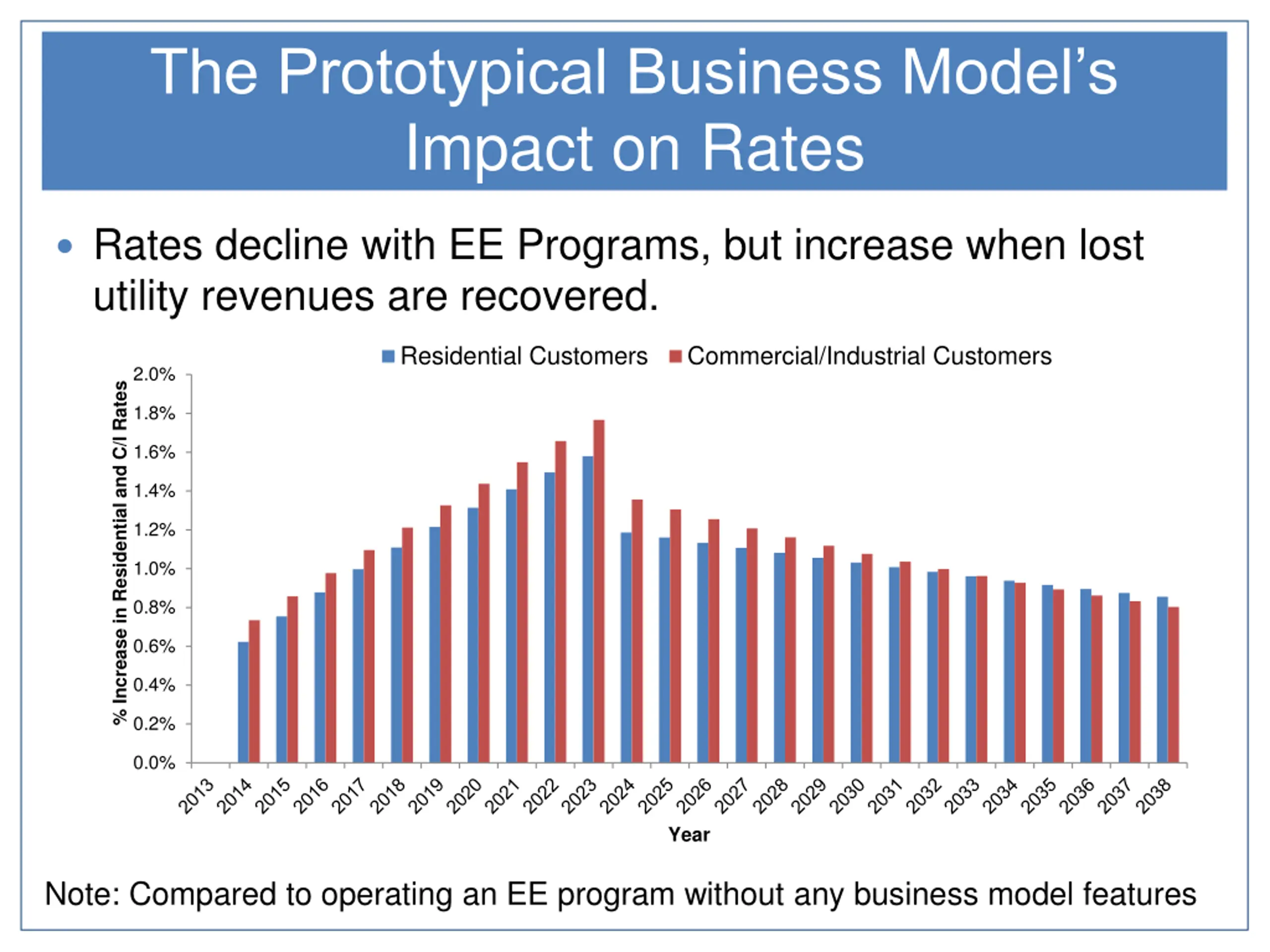 The Prototypical Business Models Impact on Rates Rates decline with EE Programs, but increase when lost utility revenues are recovered. Residential Customers Commercial/Industrial Customers 2.0% % Increase in Residential and C/I Rates 1.8% 1.6% 1.4% 1.2% 1.0% 0.8% 0.6% 0.4% 0.2% 0.0% Year Note: Compared to operating an EE program without any business model features