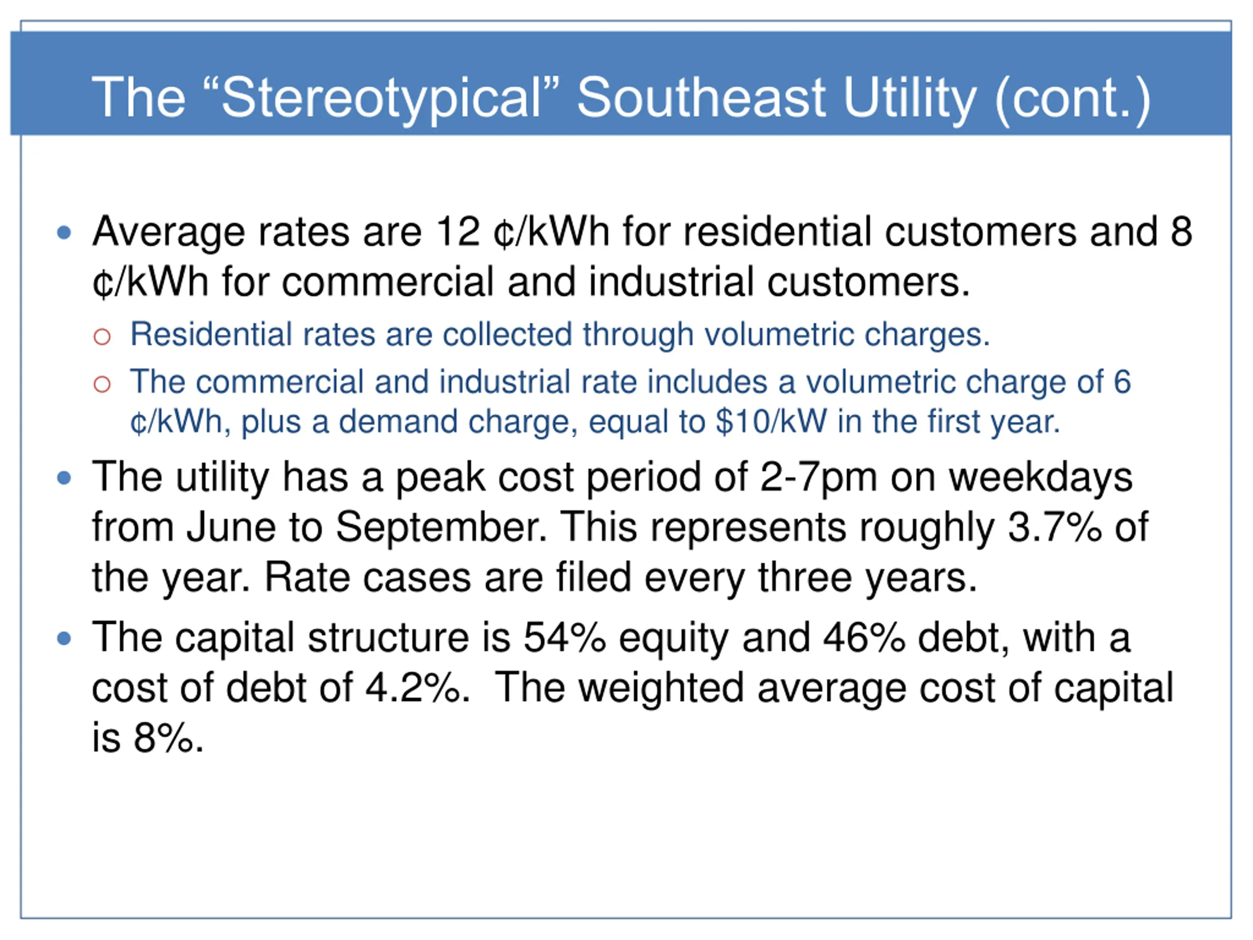 The Stereotypical Southeast Utility (cont.) Average rates are 12 /kWh for residential customers and 8 /kWh for commercial and industrial customers. Residential rates are collected through volumetric charges. The commercial and industrial rate includes a volumetric charge of 6 /kWh, plus a demand charge, equal to $10/kW in the first year. The utility has a peak cost period of 2-7pm on weekdays from June to September. This represents roughly 3.7% of the year. Rate cases are filed every three years. The capital structure is 54% equity and 46% debt, with a cost of debt of 4.2%. The weighted average cost of capital is 8%.