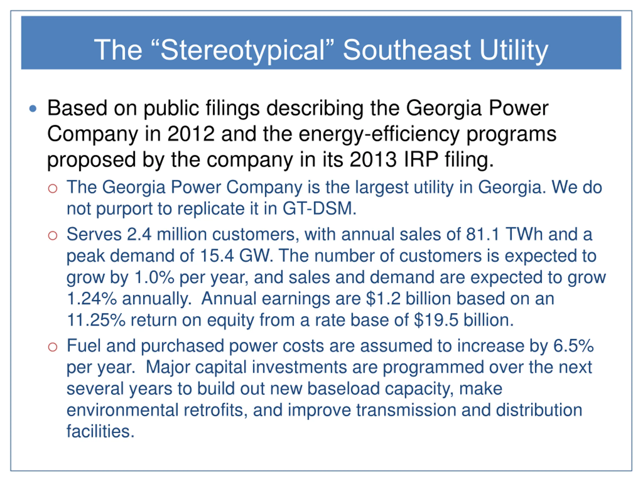 The Stereotypical Southeast Utility Based on public filings describing the Georgia Power Company in 2012 and the energy-efficiency programs proposed by the company in its 2013 IRP filing. The Georgia Power Company is the largest utility in Georgia. We do not purport to replicate it in GT-DSM. Serves 2.4 million customers, with annual sales of 81.1 TWh and a peak demand of 15.4 GW. The number of customers is expected to grow by 1.0% per year, and sales and demand are expected to grow 1.24% annually. Annual earnings are $1.2 billion based on an 11.25% return on equity from a rate base of $19.5 billion. Fuel and purchased power costs are assumed to increase by 6.5% per year. Major capital investments are programmed over the next several years to build out new baseload capacity, make environmental retrofits, and improve transmission and distribution facilities.