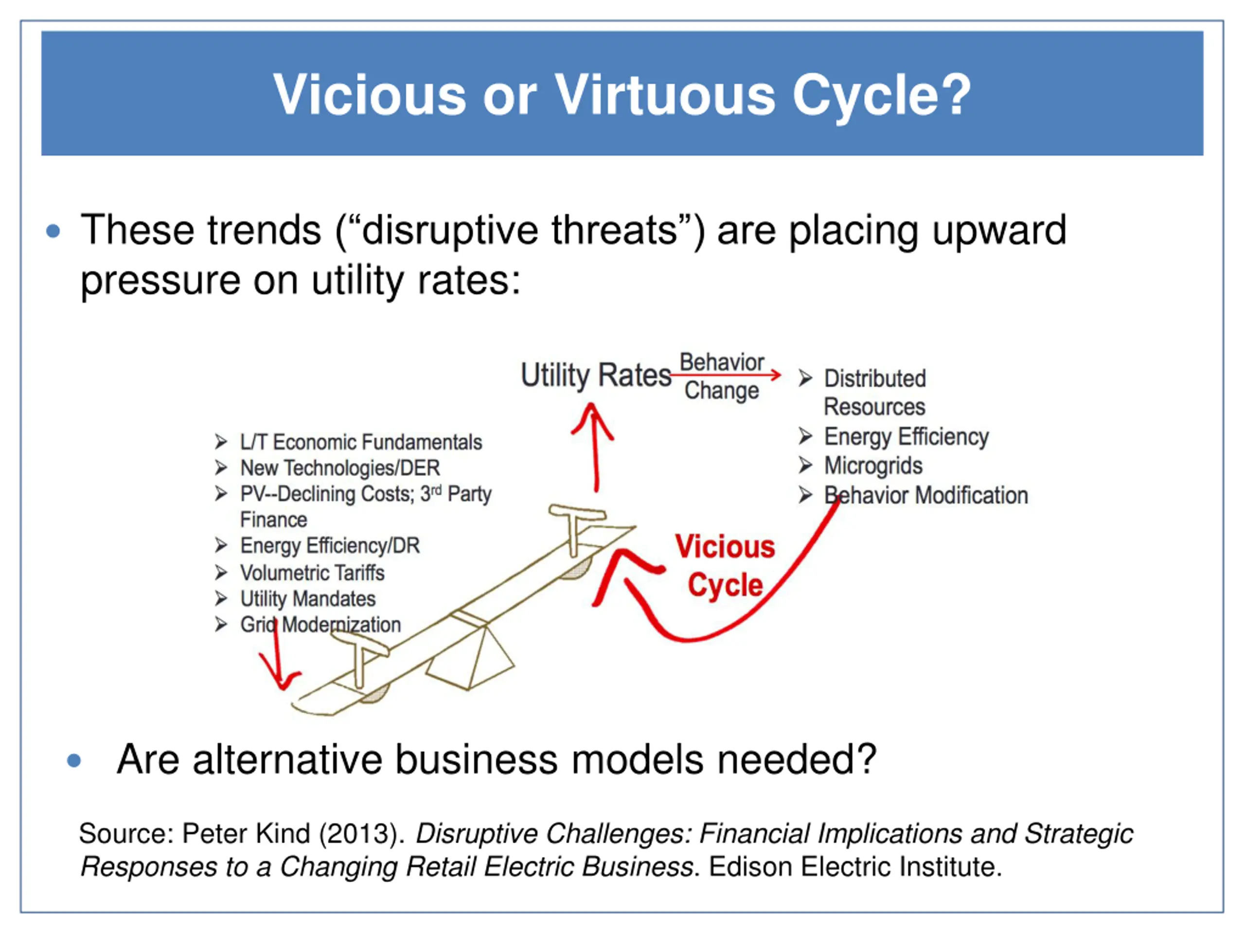 Vicious or Virtuous Cycle? These trends ( disruptive threats ) are placing upward pressure on utility rates: Are alternative business models needed? Source: Peter Kind (2013). Disruptive Challenges: Financial Implications and Strategic Responses to a Changing Retail Electric Business. Edison Electric Institute.