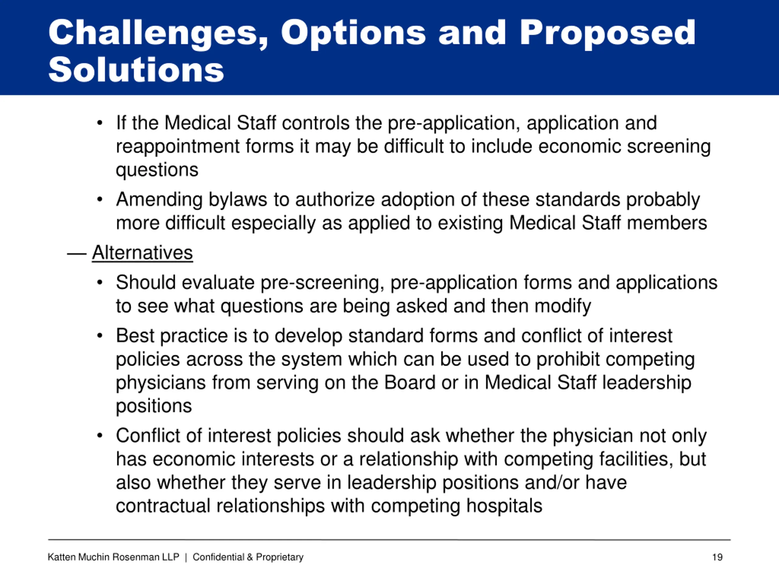 Challenges, Options and Proposed Solutions Can require higher eligibility for participating in an ACO/CIN Allows hospital to be more selective and better maintain quality and continuity of care Prevents disclosure of sensitive competitive and strategic information Avoids unnecessary patient transfers to competing hospitals and facilities A pre-screening application form is typically used Cons Could lead to legal challenges based on allegations of illegal anti- competitive conduct, discrimination, breach of contract, tortious interference, etc., especially if applied to existing members without some form of hearing Politically difficult to obtain Medical Staff support Requires well documented justification and must be Board driven Katten Muchin Rosenman LLP | Confidential & Proprietary 18