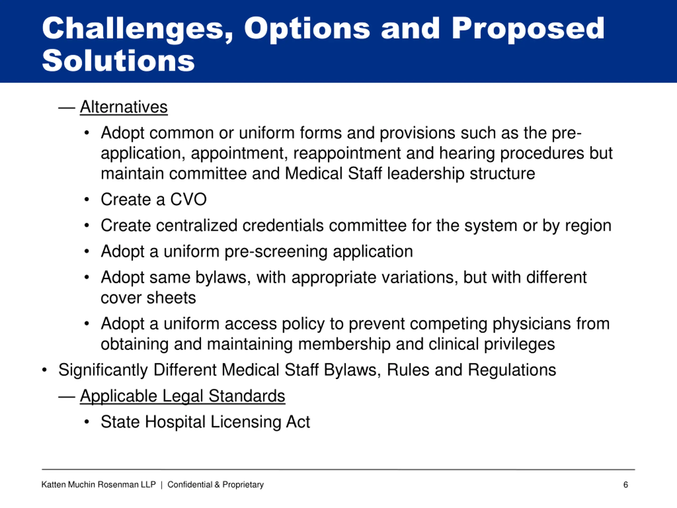 Challenges, Options and Proposed Solutions Cons Disparate cultures, Medical Staff profiles (employed versus independent), geography, etc., make the effort to unify more difficult to accomplish How do you choose the best model set of bylaws and policies? Amendment process to achieve single unified staff is detailed and success of obtaining approval is uncertain Must take into account different state statutory requirements if part of a multi-state system will state approve a single staff? Must follow Medicare CoPs and state laws regarding which professionals can serve on the Medical Staff Can only have a common parent board and not separate hospital boards. Potential for unraveling must give Medical Staffs the ability to opt- out. Katten Muchin Rosenman LLP | Confidential & Proprietary 5