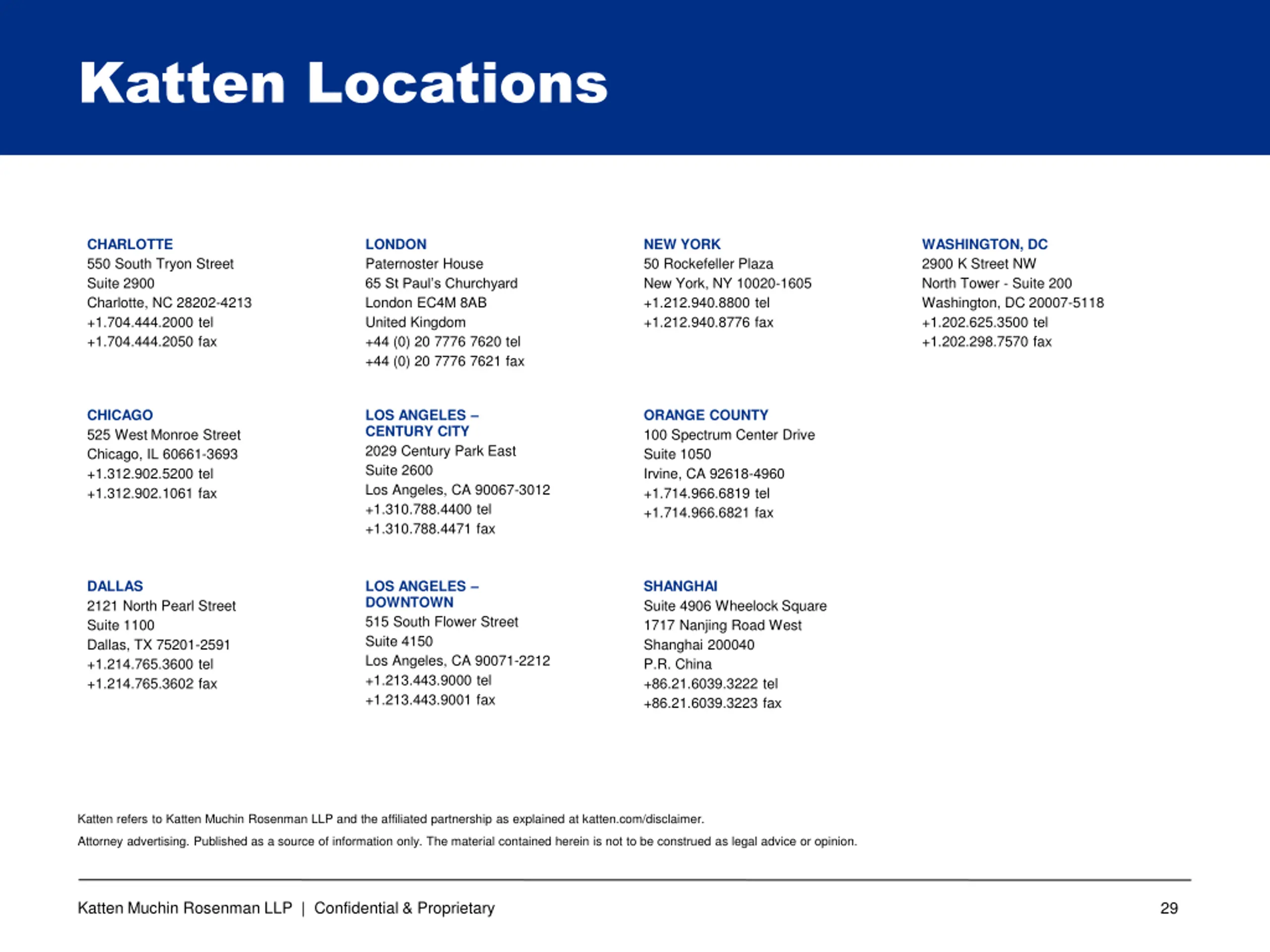 Katten Locations CHARLOTTE 550 South Tryon Street Suite 2900 Charlotte, NC 28202-4213 +1.704.444.2000 tel +1.704.444.2050 fax LONDON Paternoster House 65 St Paul s Churchyard London EC4M 8AB United Kingdom +44 (0) 20 7776 7620 tel +44 (0) 20 7776 7621 fax NEW YORK 50 Rockefeller Plaza New York, NY 10020-1605 +1.212.940.8800 tel +1.212.940.8776 fax WASHINGTON, DC 2900 K Street NW North Tower - Suite 200 Washington, DC 20007-5118 +1.202.625.3500 tel +1.202.298.7570 fax CHICAGO 525 West Monroe Street Chicago, IL 60661-3693 +1.312.902.5200 tel +1.312.902.1061 fax LOS ANGELES CENTURY CITY 2029 Century Park East Suite 2600 Los Angeles, CA 90067-3012 +1.310.788.4400 tel +1.310.788.4471 fax ORANGE COUNTY 100 Spectrum Center Drive Suite 1050 Irvine, CA 92618-4960 +1.714.966.6819 tel +1.714.966.6821 fax DALLAS 2121 North Pearl Street Suite 1100 Dallas, TX 75201-2591 +1.214.765.3600 tel +1.214.765.3602 fax LOS ANGELES DOWNTOWN 515 South Flower Street Suite 4150 Los Angeles, CA 90071-2212 +1.213.443.9000 tel +1.213.443.9001 fax SHANGHAI Suite 4906 Wheelock Square 1717 Nanjing Road West Shanghai 200040 P.R. China +86.21.6039.3222 tel +86.21.6039.3223 fax Katten refers to Katten Muchin Rosenman LLP and the affiliated partnership as explained at katten.com/disclaimer. Attorney advertising. Published as a source of information only. The material contained herein is not to be construed as legal advice or opinion. Katten Muchin Rosenman LLP | Confidential & Proprietary 29