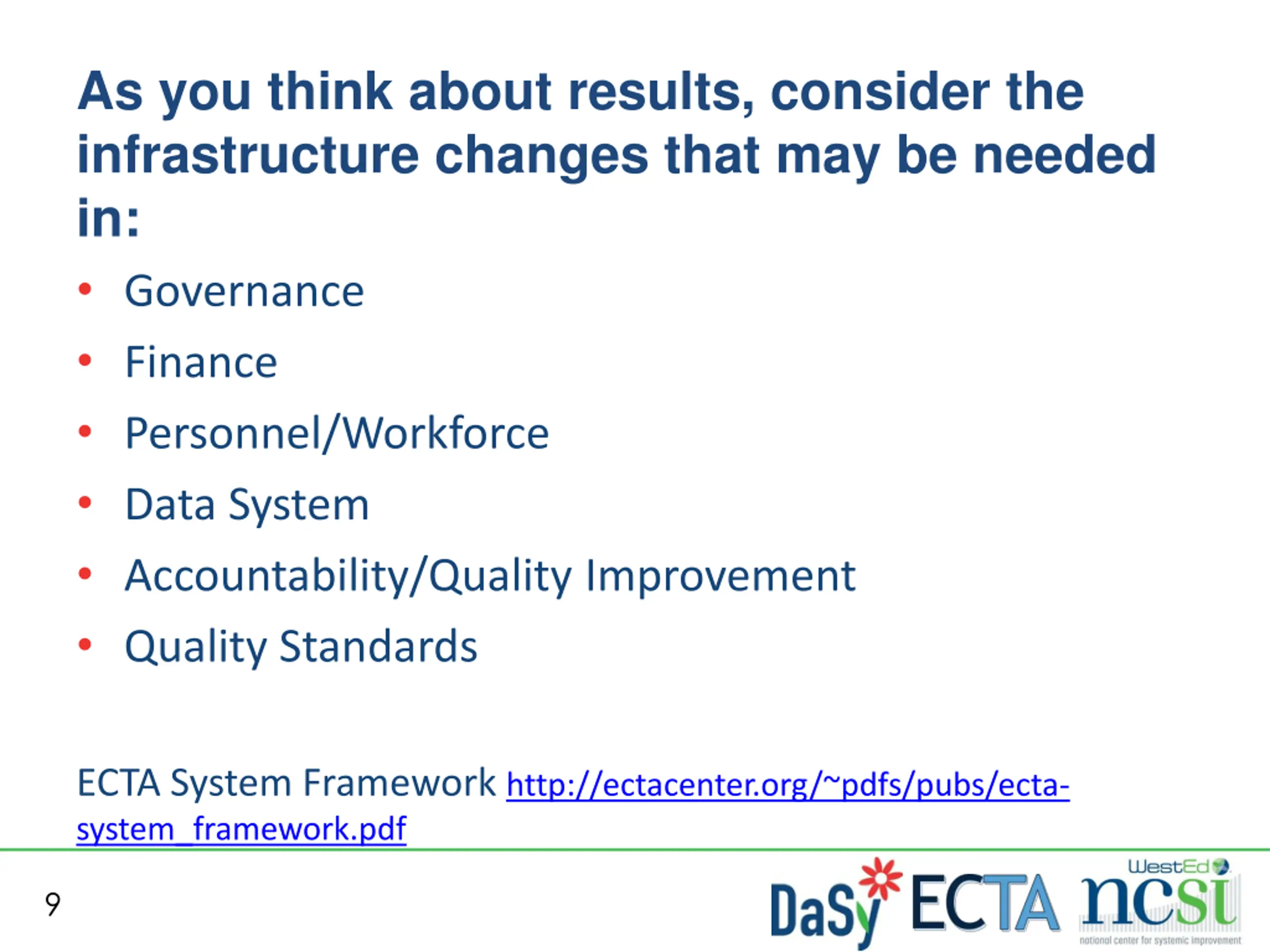 As you think about results, consider the infrastructure changes that may be needed in: Governance Finance Personnel/Workforce Data System Accountability/Quality Improvement Quality Standards ECTA System Framework http://ectacenter.org/~pdfs/pubs/ecta- system_framework.pdf 9