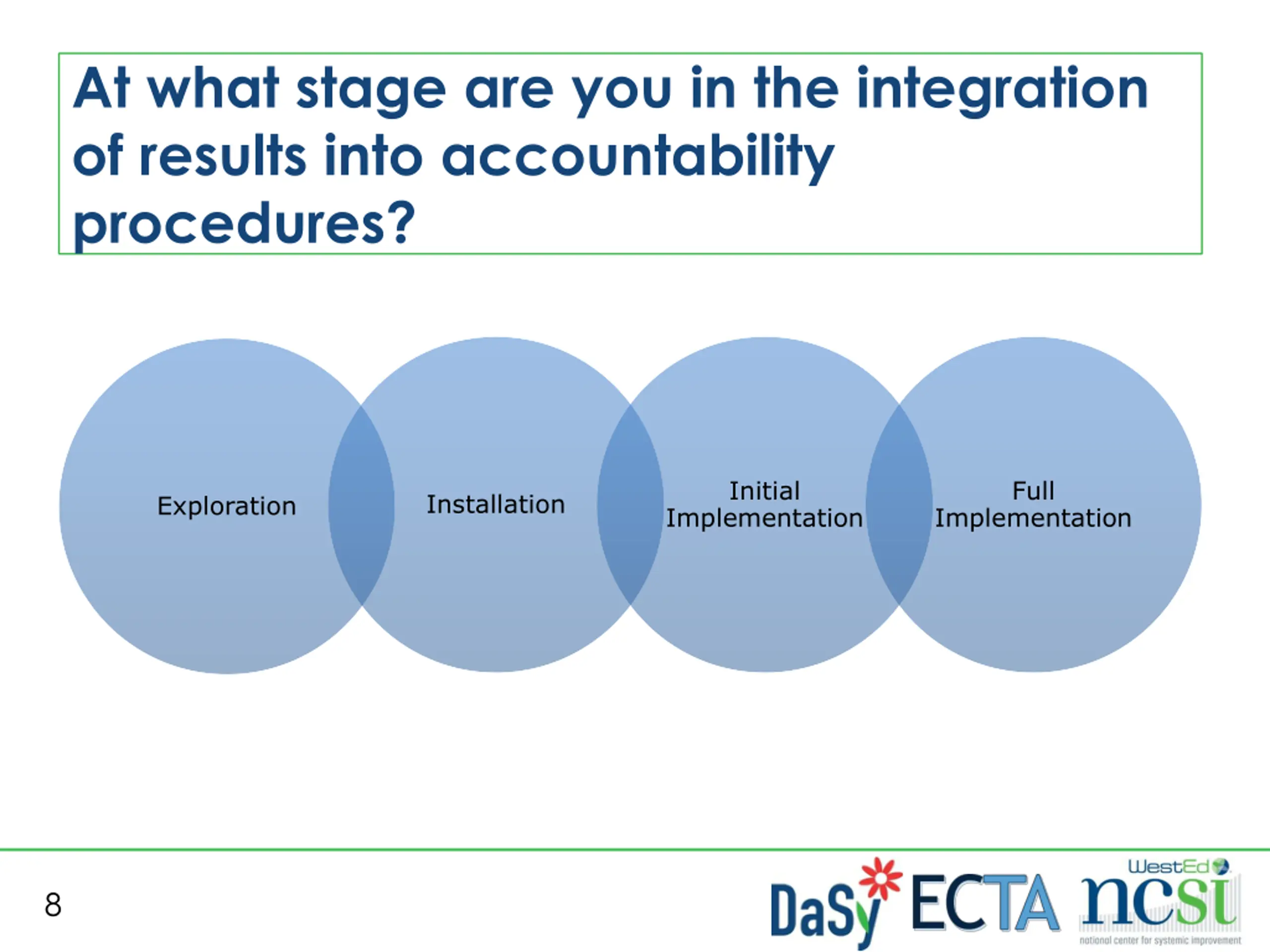 At what stage are you in the integration of results into accountability procedures? Initial Full Installation Exploration Implementation Implementation 8