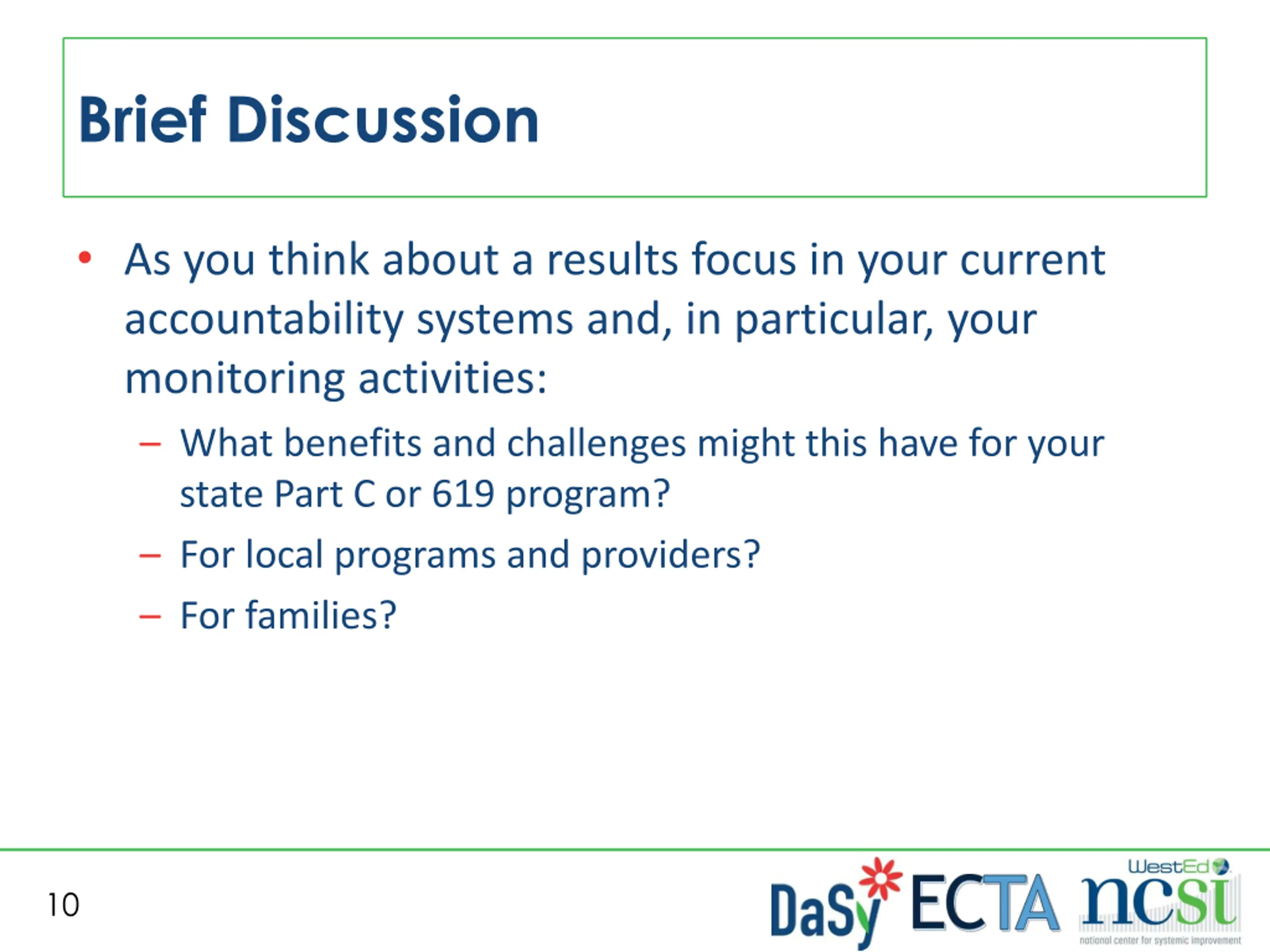 Brief Discussion As you think about a results focus in your current accountability systems and, in particular, your monitoring activities: What benefits and challenges might this have for your state Part C or 619 program? For local programs and providers? For families? 10