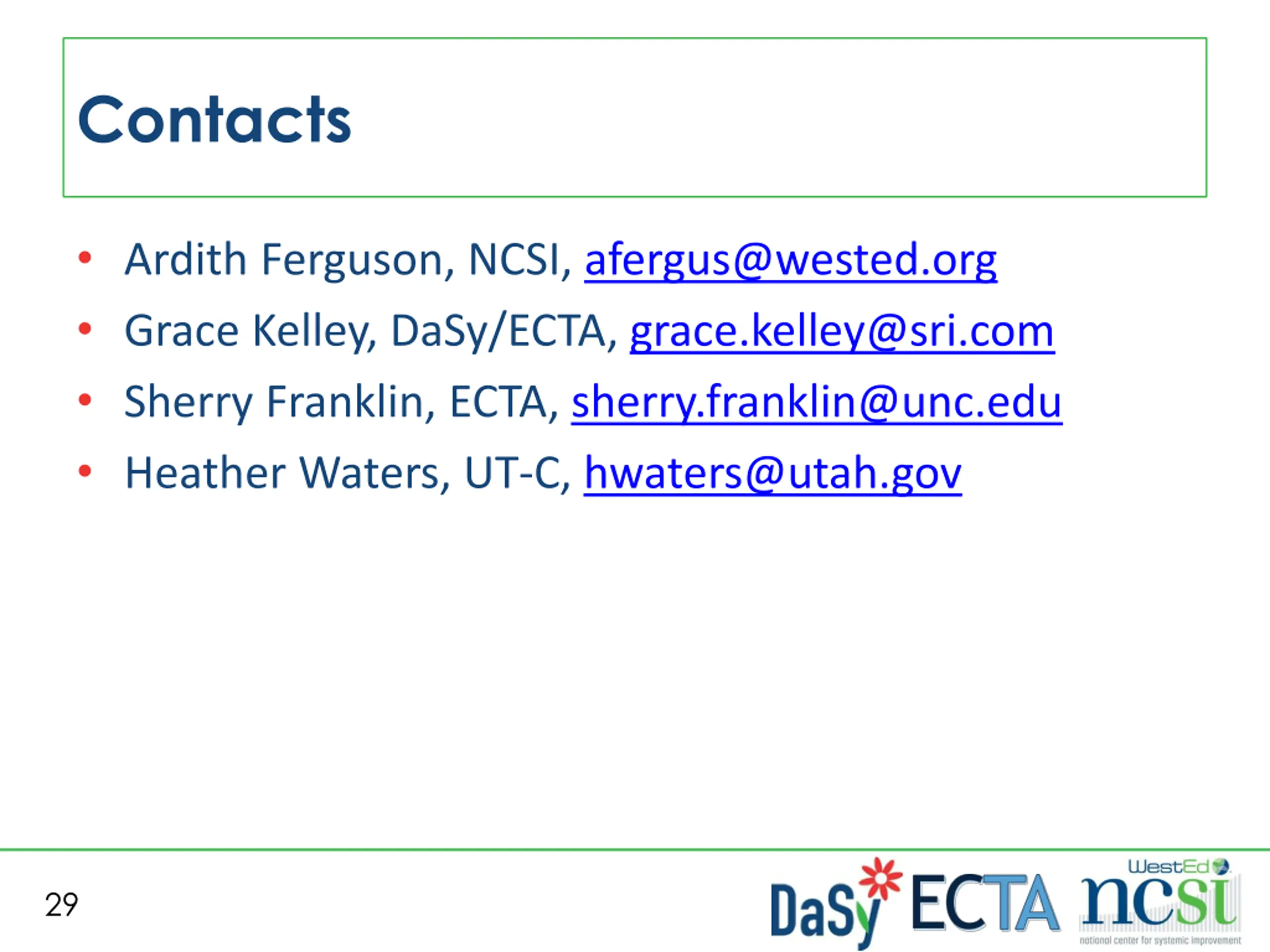 Contacts Ardith Ferguson, NCSI, afergus@wested.org Grace Kelley, DaSy/ECTA, grace.kelley@sri.com Sherry Franklin, ECTA, sherry.franklin@unc.edu Heather Waters, UT-C, hwaters@utah.gov 29