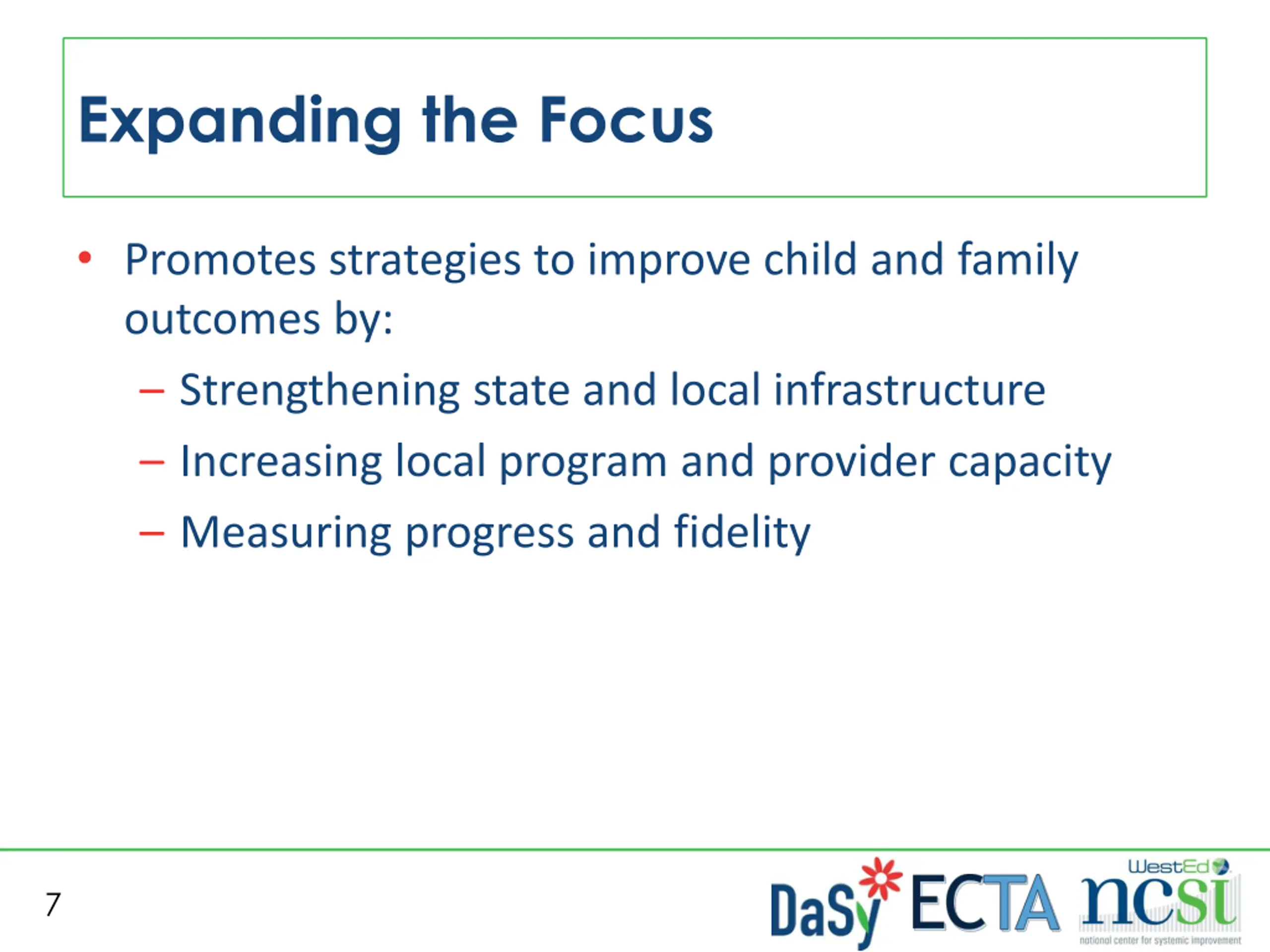 Expanding the Focus Promotes strategies to improve child and family outcomes by: Strengthening state and local infrastructure Increasing local program and provider capacity Measuring progress and fidelity 7