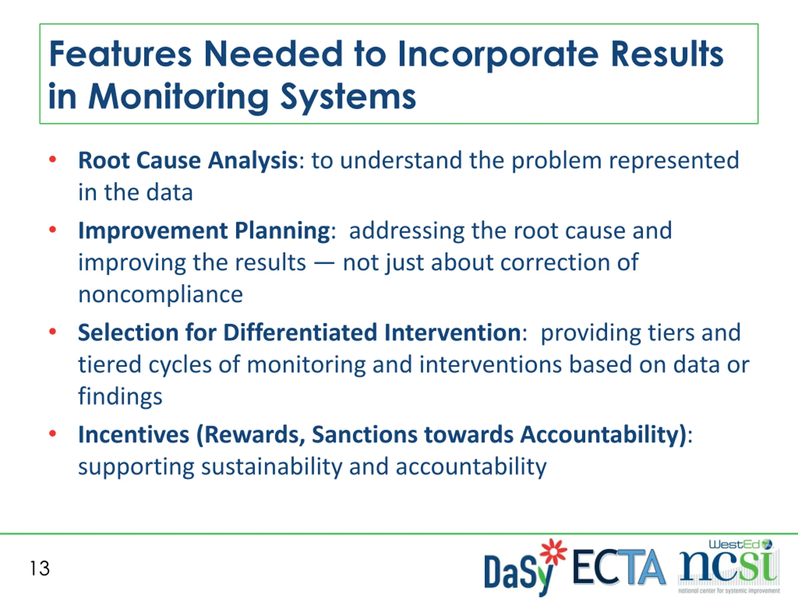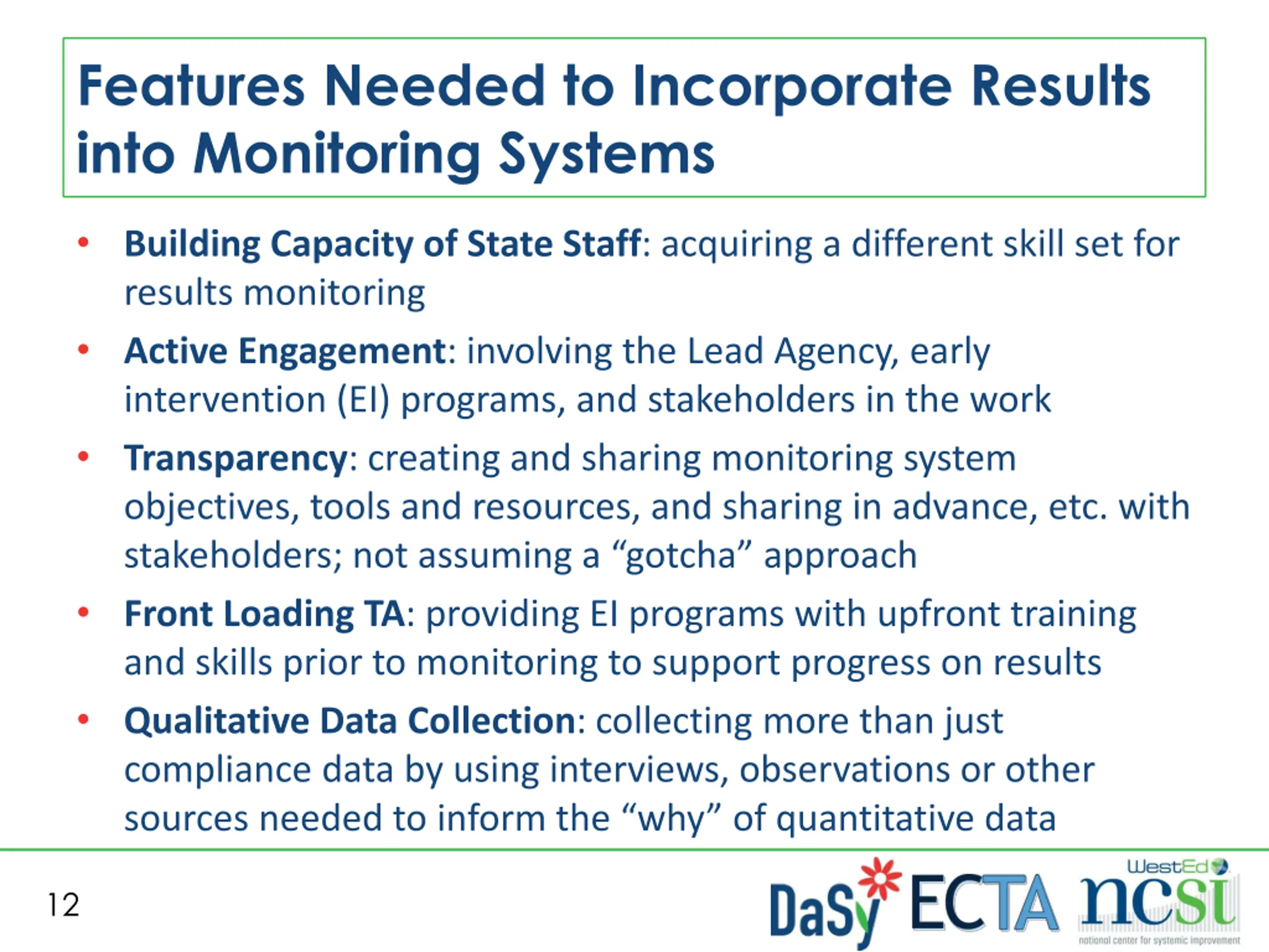 Features Needed to Incorporate Results into Monitoring Systems Building Capacity of State Staff: acquiring a different skill set for results monitoring Active Engagement: involving the Lead Agency, early intervention (EI) programs, and stakeholders in the work Transparency: creating and sharing monitoring system objectives, tools and resources, and sharing in advance, etc. with stakeholders; not assuming a gotcha approach Front Loading TA: providing EI programs with upfront training and skills prior to monitoring to support progress on results Qualitative Data Collection: collecting more than just compliance data by using interviews, observations or other sources needed to inform the why of quantitative data 12