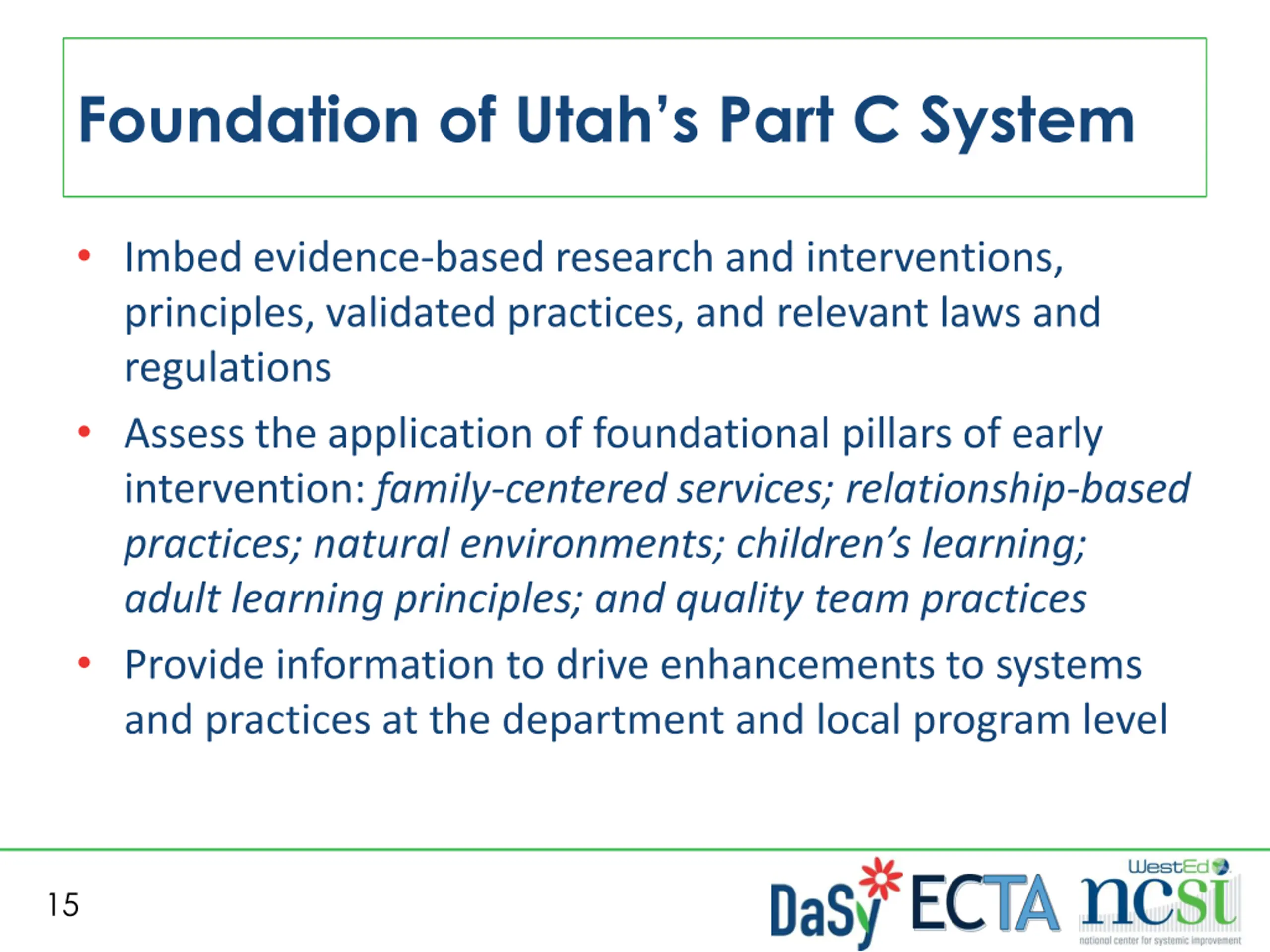 Foundation of Utahs Part C System Imbed evidence-based research and interventions, principles, validated practices, and relevant laws and regulations Assess the application of foundational pillars of early intervention: family-centered services; relationship-based practices; natural environments; children s learning; adult learning principles; and quality team practices Provide information to drive enhancements to systems and practices at the department and local program level 15