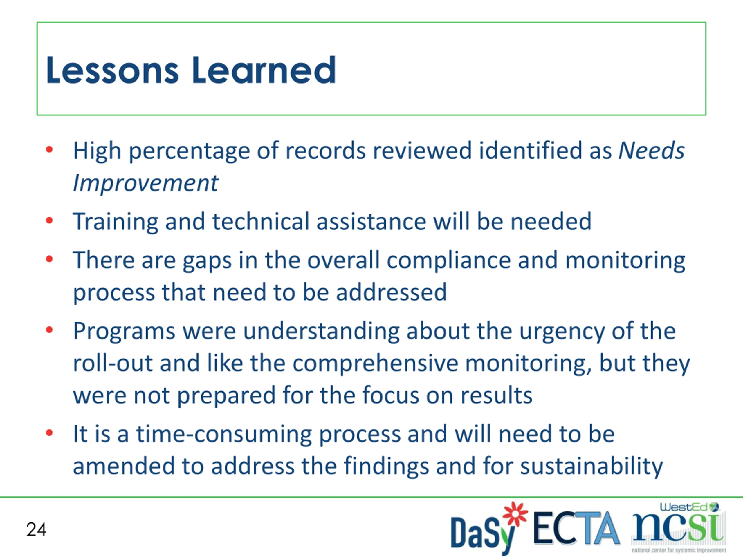 Lessons Learned High percentage of records reviewed identified as Needs Improvement Training and technical assistance will be needed There are gaps in the overall compliance and monitoring process that need to be addressed Programs were understanding about the urgency of the roll-out and like the comprehensive monitoring, but they were not prepared for the focus on results It is a time-consuming process and will need to be amended to address the findings and for sustainability 24