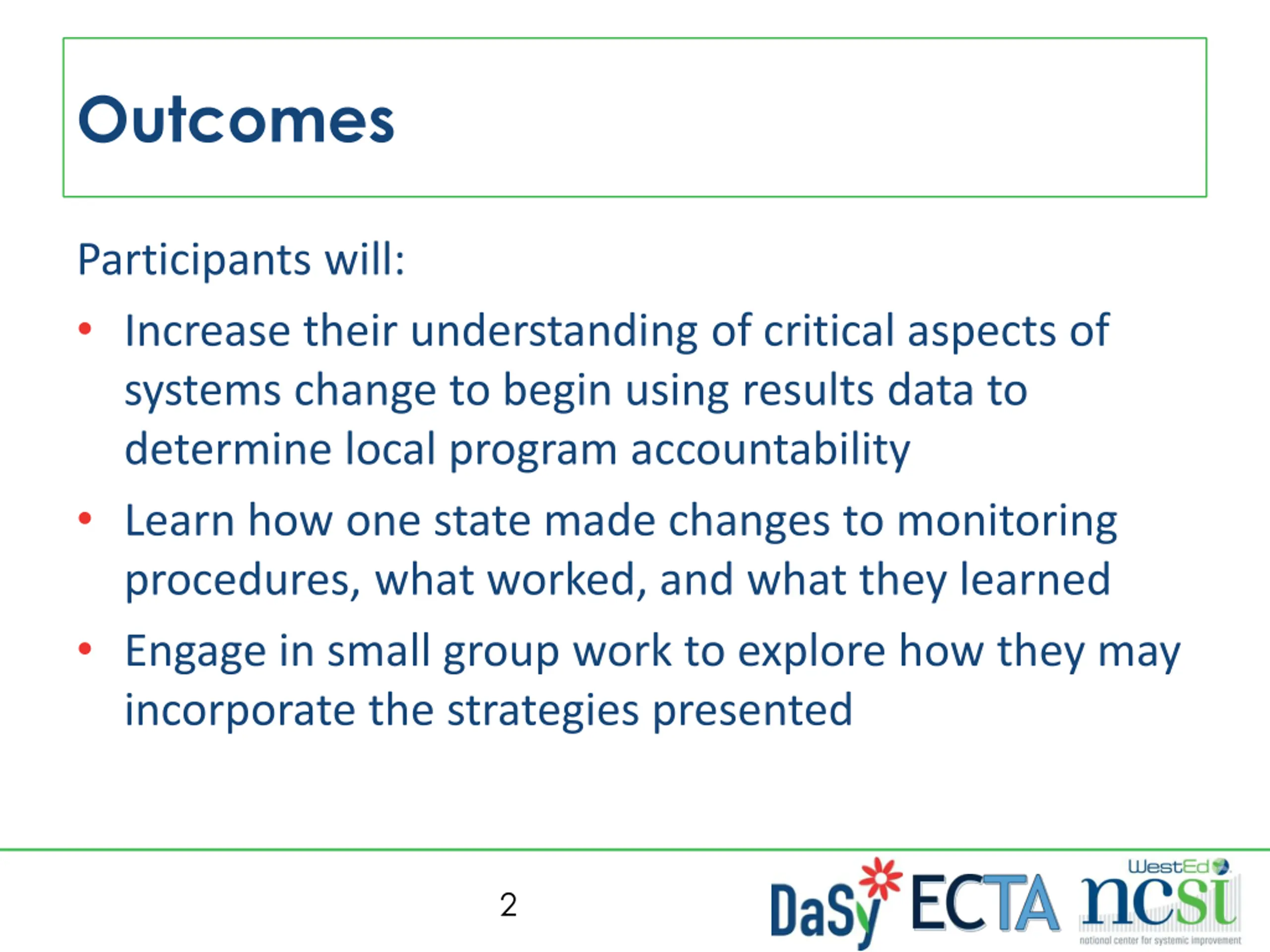 Outcomes Participants will: Increase their understanding of critical aspects of systems change to begin using results data to determine local program accountability Learn how one state made changes to monitoring procedures, what worked, and what they learned Engage in small group work to explore how they may incorporate the strategies presented 2