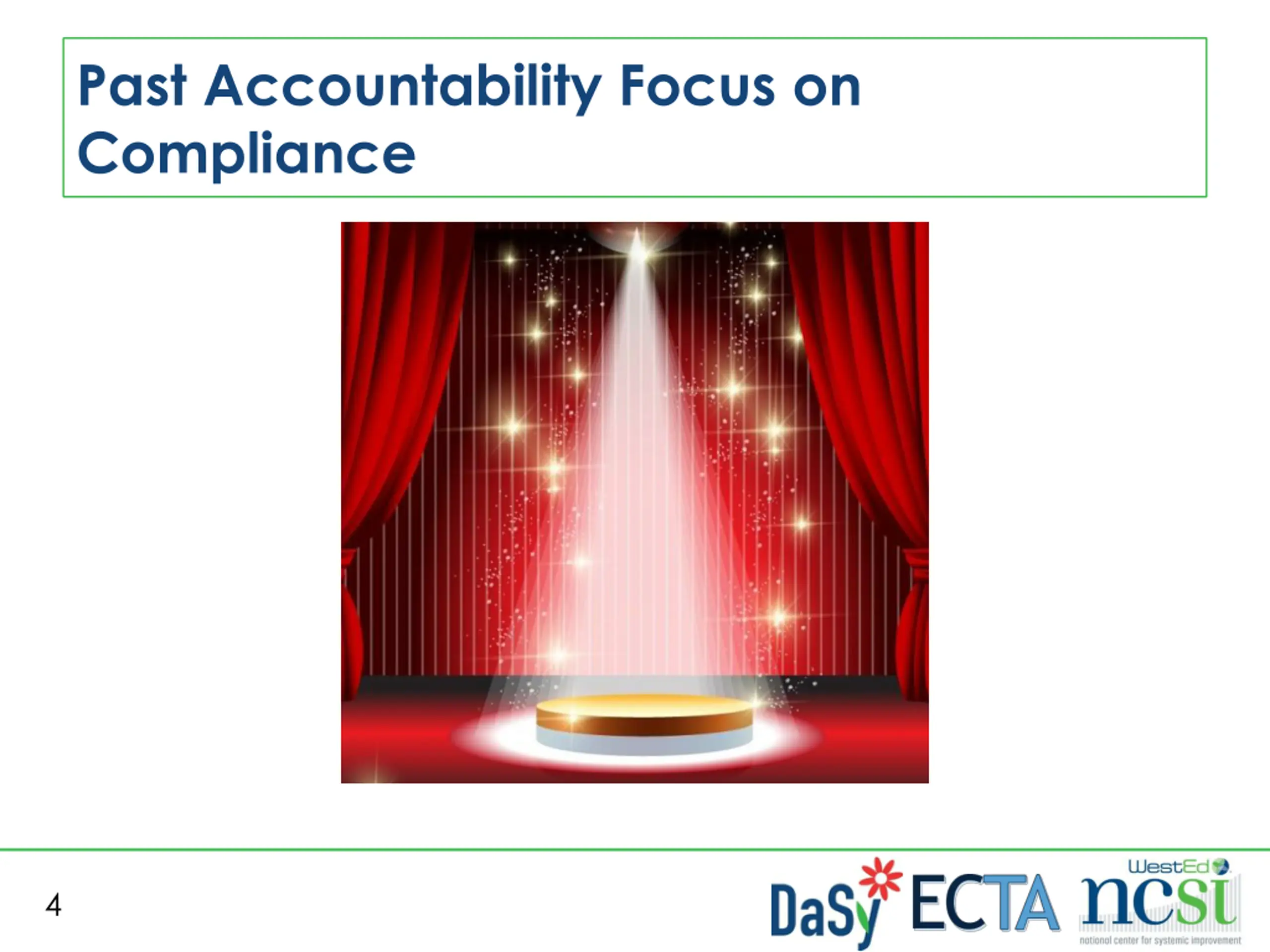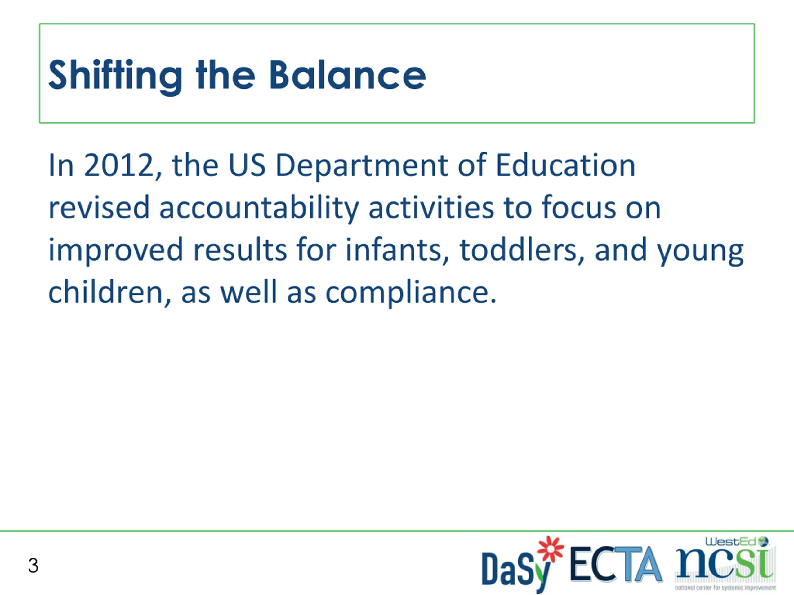 Shifting the Balance In 2012, the US Department of Education revised accountability activities to focus on improved results for infants, toddlers, and young children, as well as compliance. 3