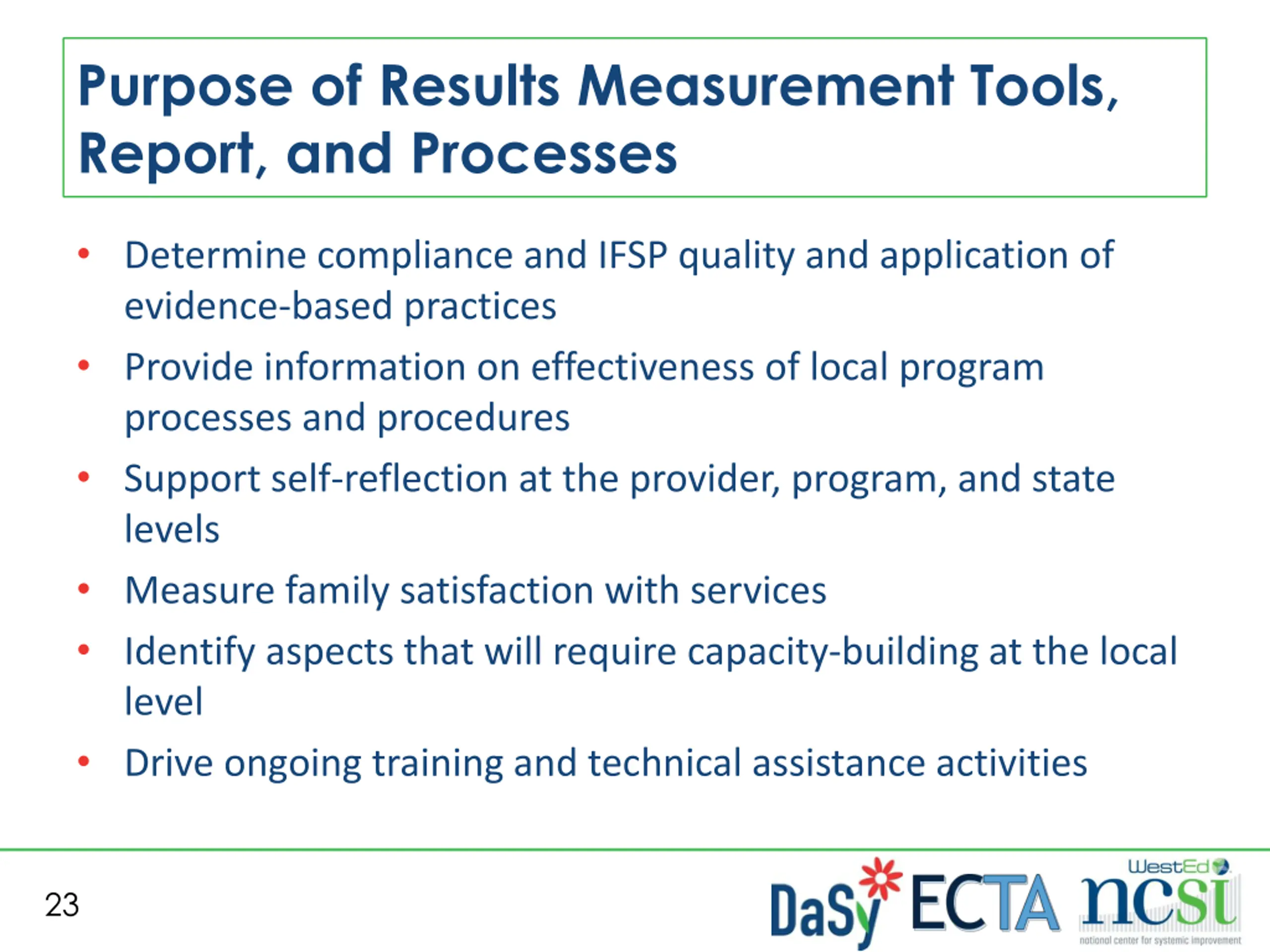 Purpose of Results Measurement Tools, Report, and Processes Determine compliance and IFSP quality and application of evidence-based practices Provide information on effectiveness of local program processes and procedures Support self-reflection at the provider, program, and state levels Measure family satisfaction with services Identify aspects that will require capacity-building at the local level Drive ongoing training and technical assistance activities 23