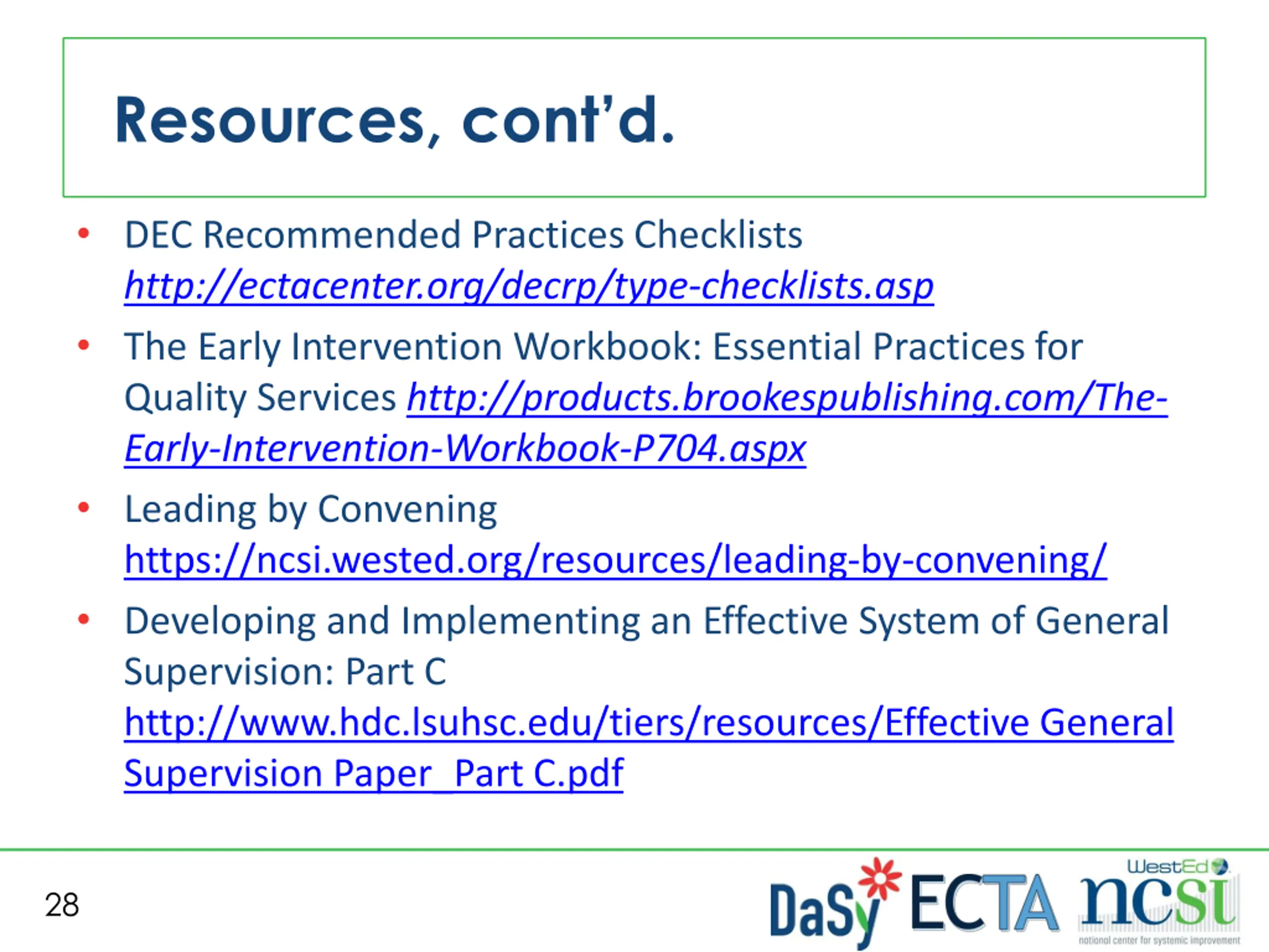 Resources, contd. DEC Recommended Practices Checklists http://ectacenter.org/decrp/type-checklists.asp The Early Intervention Workbook: Essential Practices for Quality Services http://products.brookespublishing.com/The- Early-Intervention-Workbook-P704.aspx Leading by Convening https://ncsi.wested.org/resources/leading-by-convening/ Developing and Implementing an Effective System of General Supervision: Part C http://www.hdc.lsuhsc.edu/tiers/resources/Effective General Supervision Paper_Part C.pdf 28