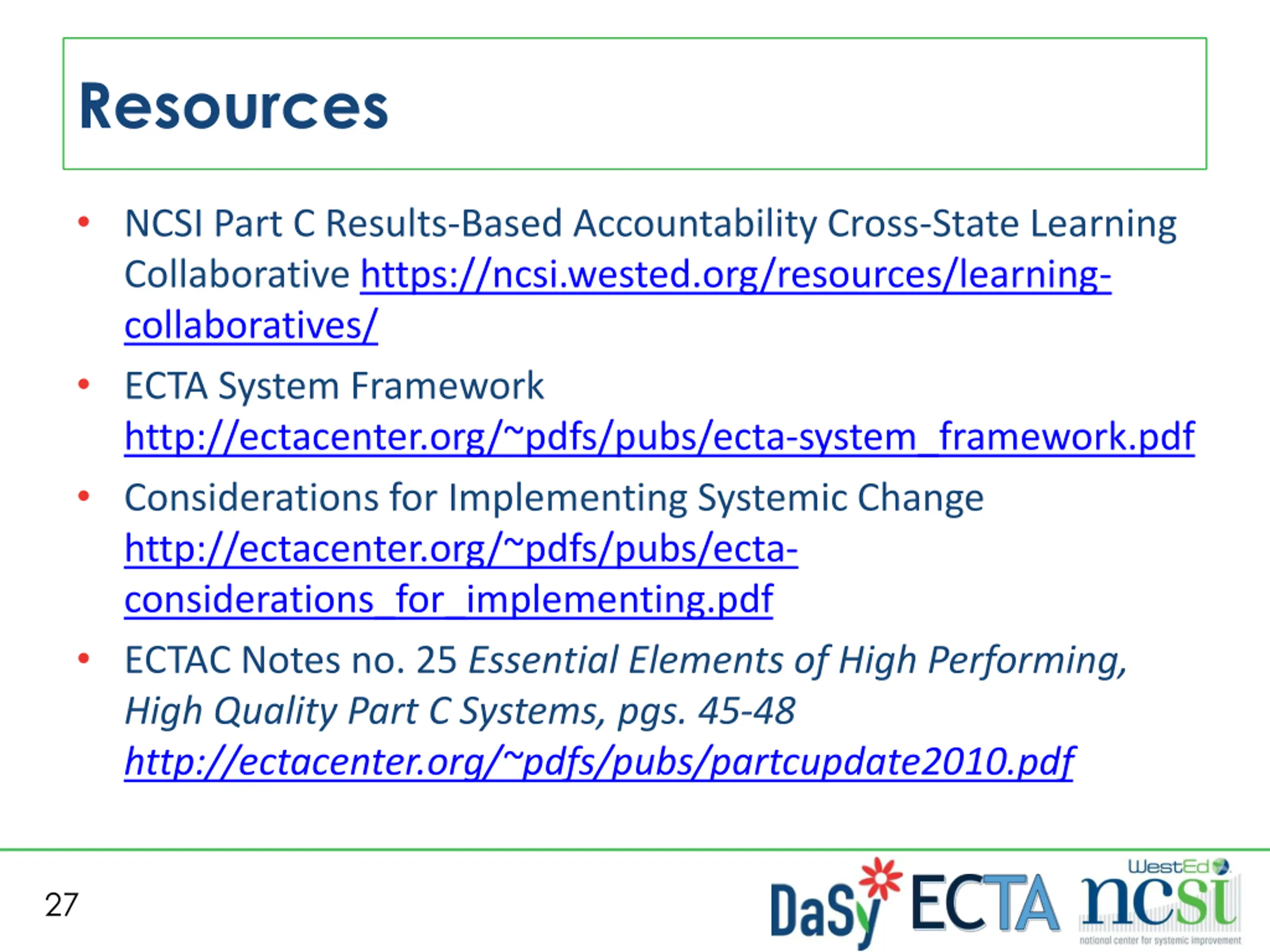 Resources NCSI Part C Results-Based Accountability Cross-State Learning Collaborative https://ncsi.wested.org/resources/learning- collaboratives/ ECTA System Framework http://ectacenter.org/~pdfs/pubs/ecta-system_framework.pdf Considerations for Implementing Systemic Change http://ectacenter.org/~pdfs/pubs/ecta- considerations_for_implementing.pdf ECTAC Notes no. 25 Essential Elements of High Performing, High Quality Part C Systems, pgs. 45-48 http://ectacenter.org/~pdfs/pubs/partcupdate2010.pdf 27