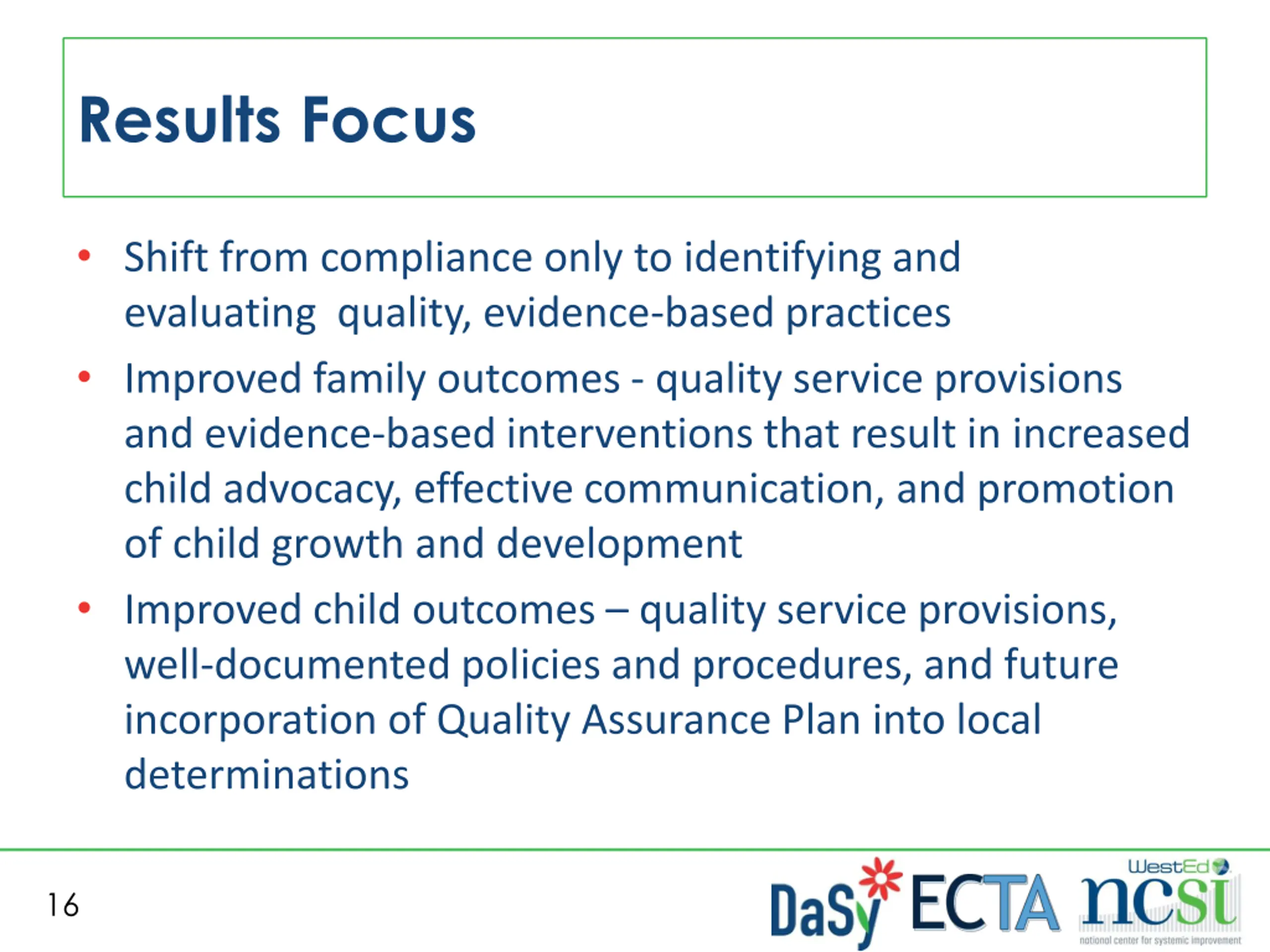 Results Focus Shift from compliance only to identifying and evaluating quality, evidence-based practices Improved family outcomes - quality service provisions and evidence-based interventions that result in increased child advocacy, effective communication, and promotion of child growth and development Improved child outcomes quality service provisions, well-documented policies and procedures, and future incorporation of Quality Assurance Plan into local determinations 16