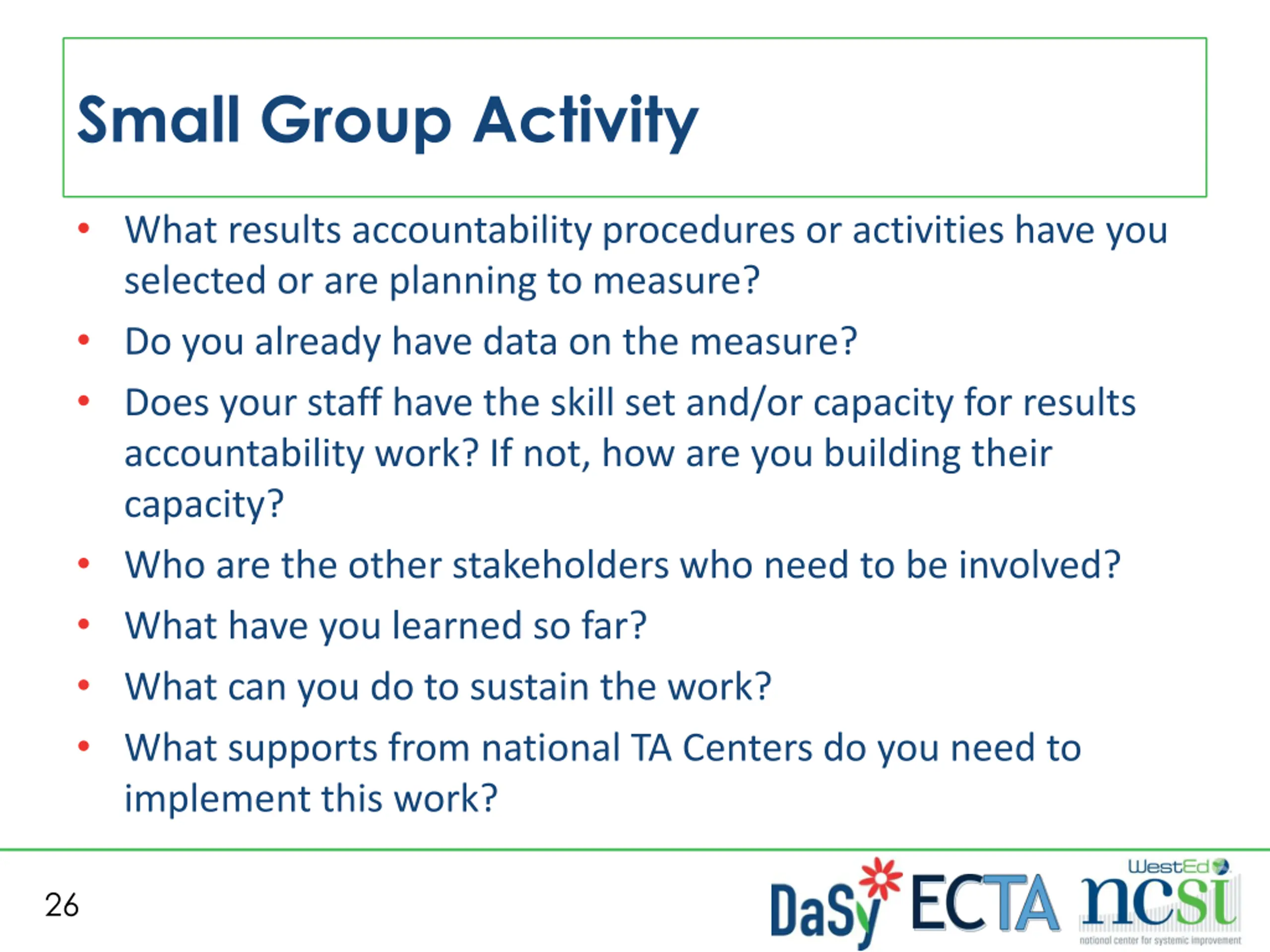 Small Group Activity What results accountability procedures or activities have you selected or are planning to measure? Do you already have data on the measure? Does your staff have the skill set and/or capacity for results accountability work? If not, how are you building their capacity? Who are the other stakeholders who need to be involved? What have you learned so far? What can you do to sustain the work? What supports from national TA Centers do you need to implement this work? 26