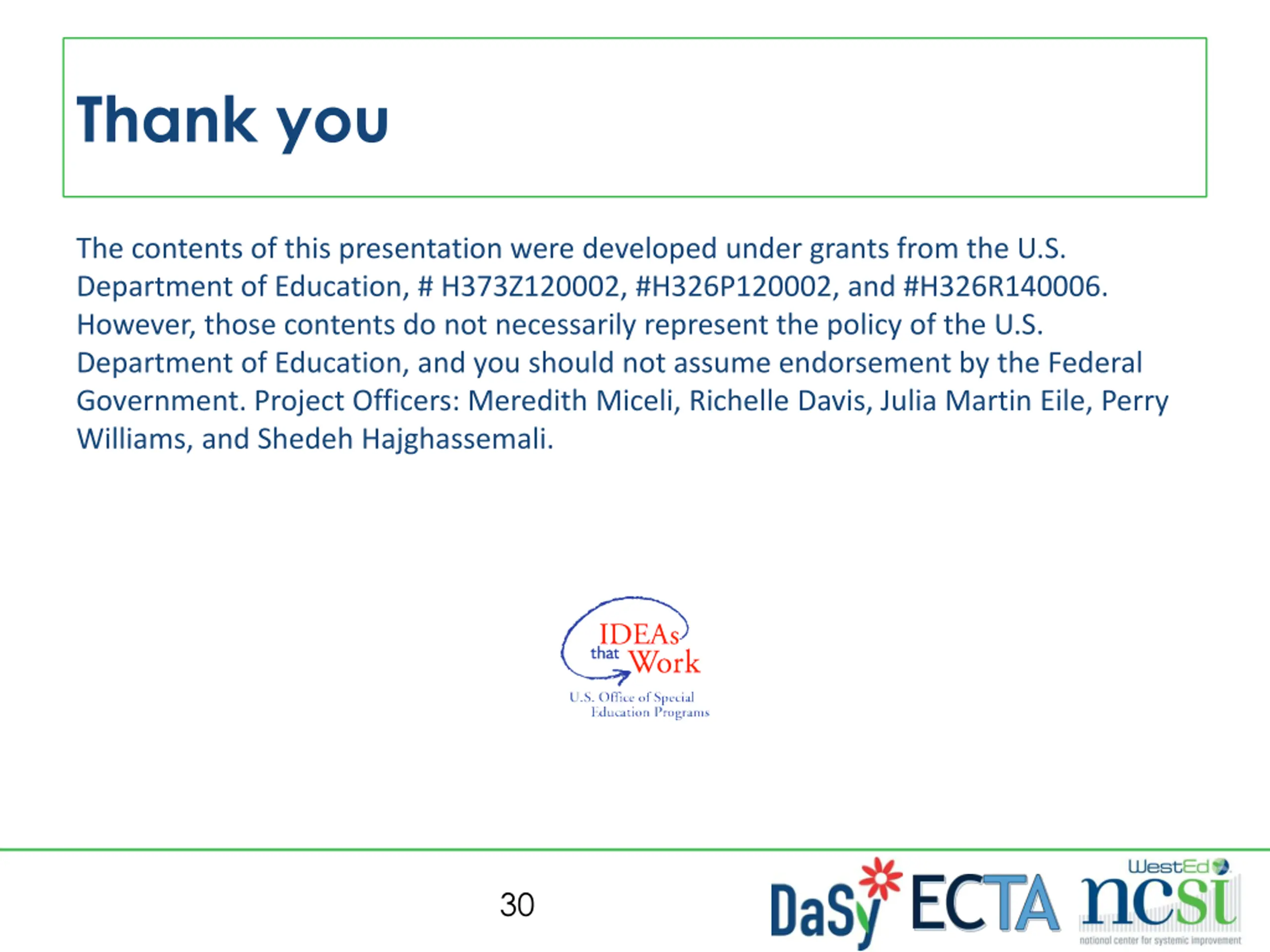 Thank you The contents of this presentation were developed under grants from the U.S. Department of Education, # H373Z120002, #H326P120002, and #H326R140006. However, those contents do not necessarily represent the policy of the U.S. Department of Education, and you should not assume endorsement by the Federal Government. Project Officers: Meredith Miceli, Richelle Davis, Julia Martin Eile, Perry Williams, and Shedeh Hajghassemali. 30