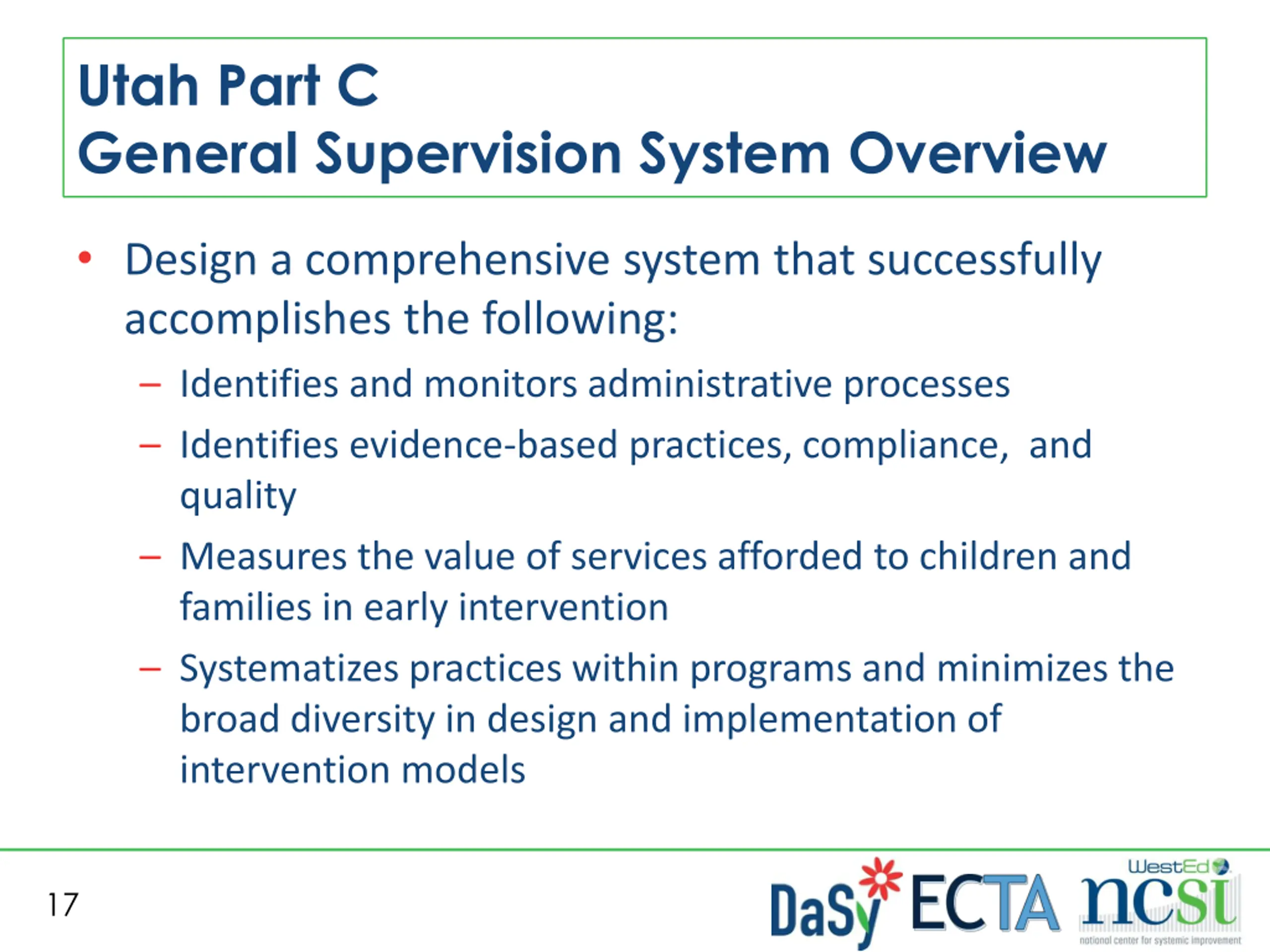 Utah Part C General Supervision System Overview Design a comprehensive system that successfully accomplishes the following: Identifies and monitors administrative processes Identifies evidence-based practices, compliance, and quality Measures the value of services afforded to children and families in early intervention Systematizes practices within programs and minimizes the broad diversity in design and implementation of intervention models 17