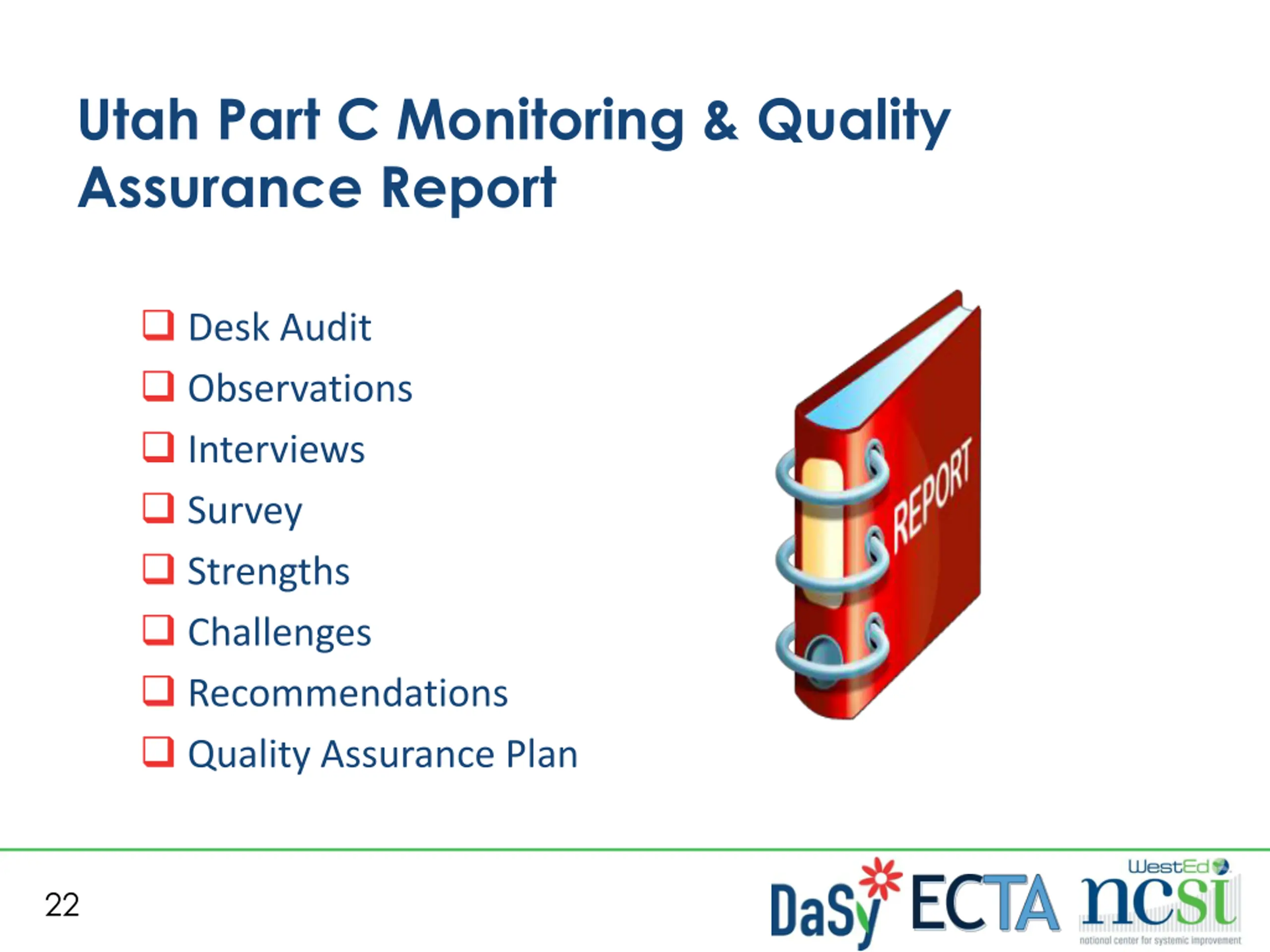 Utah Part C Monitoring & Quality Assurance Report Desk Audit Observations Interviews Survey Strengths Challenges Recommendations Quality Assurance Plan 22
