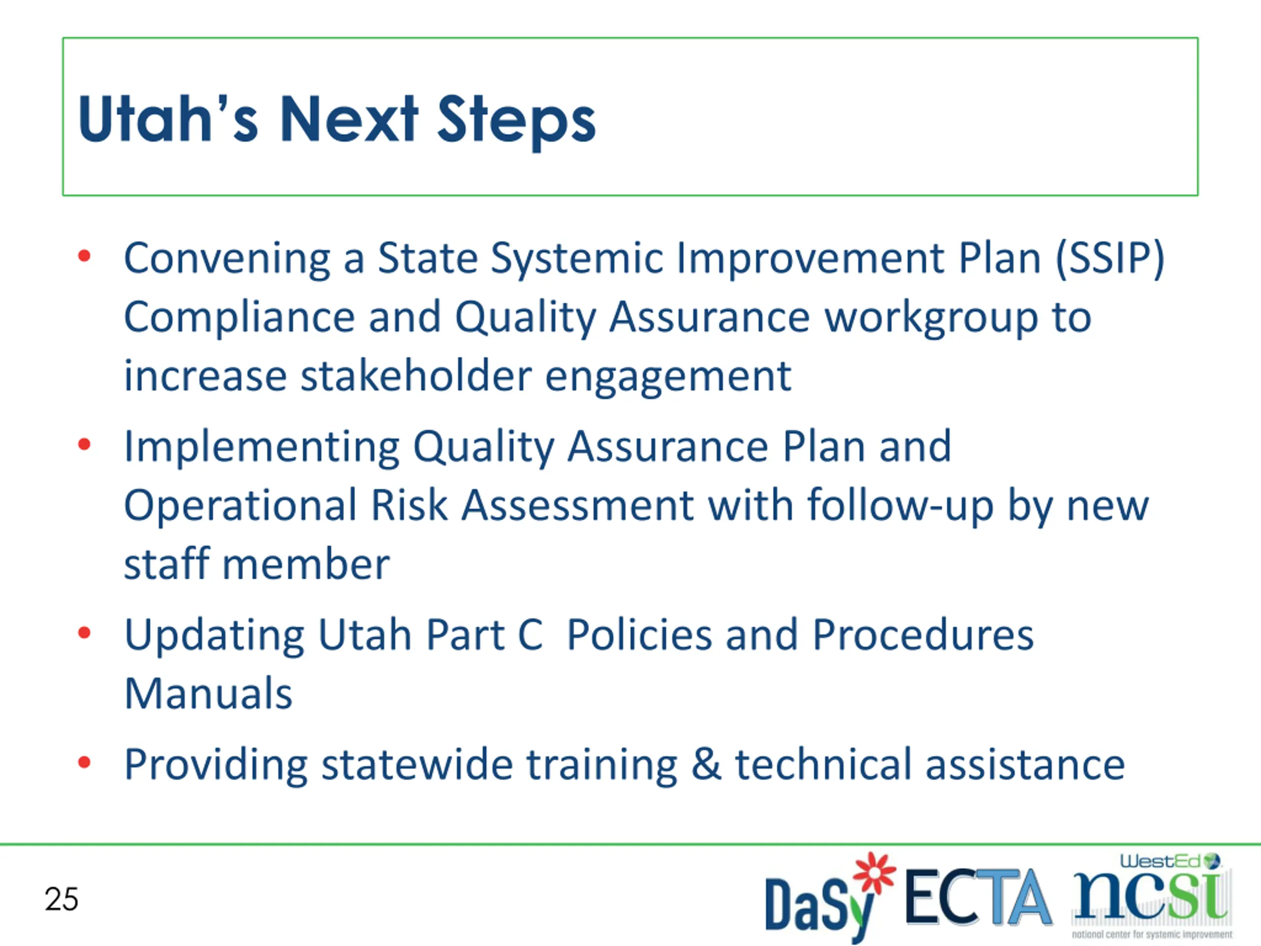 Utahs Next Steps Convening a State Systemic Improvement Plan (SSIP) Compliance and Quality Assurance workgroup to increase stakeholder engagement Implementing Quality Assurance Plan and Operational Risk Assessment with follow-up by new staff member Updating Utah Part C Policies and Procedures Manuals Providing statewide training & technical assistance 25