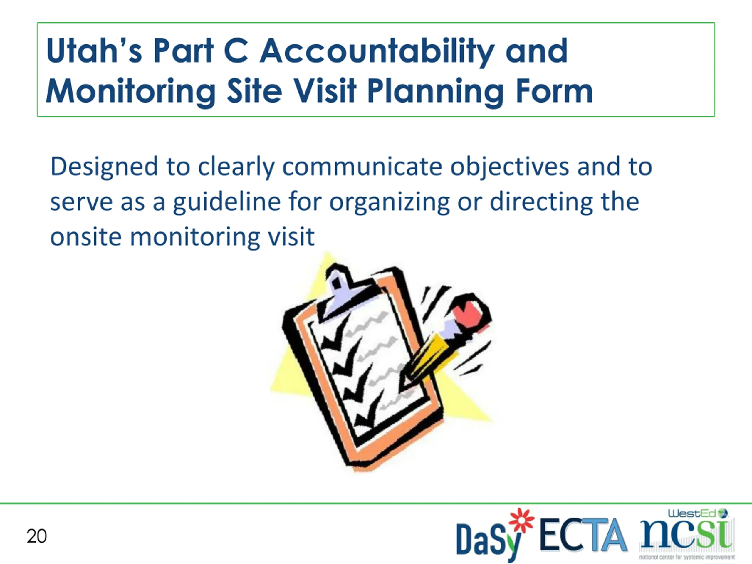 Utahs Part C Accountability and Monitoring Site Visit Planning Form Designed to clearly communicate objectives and to serve as a guideline for organizing or directing the onsite monitoring visit 20
