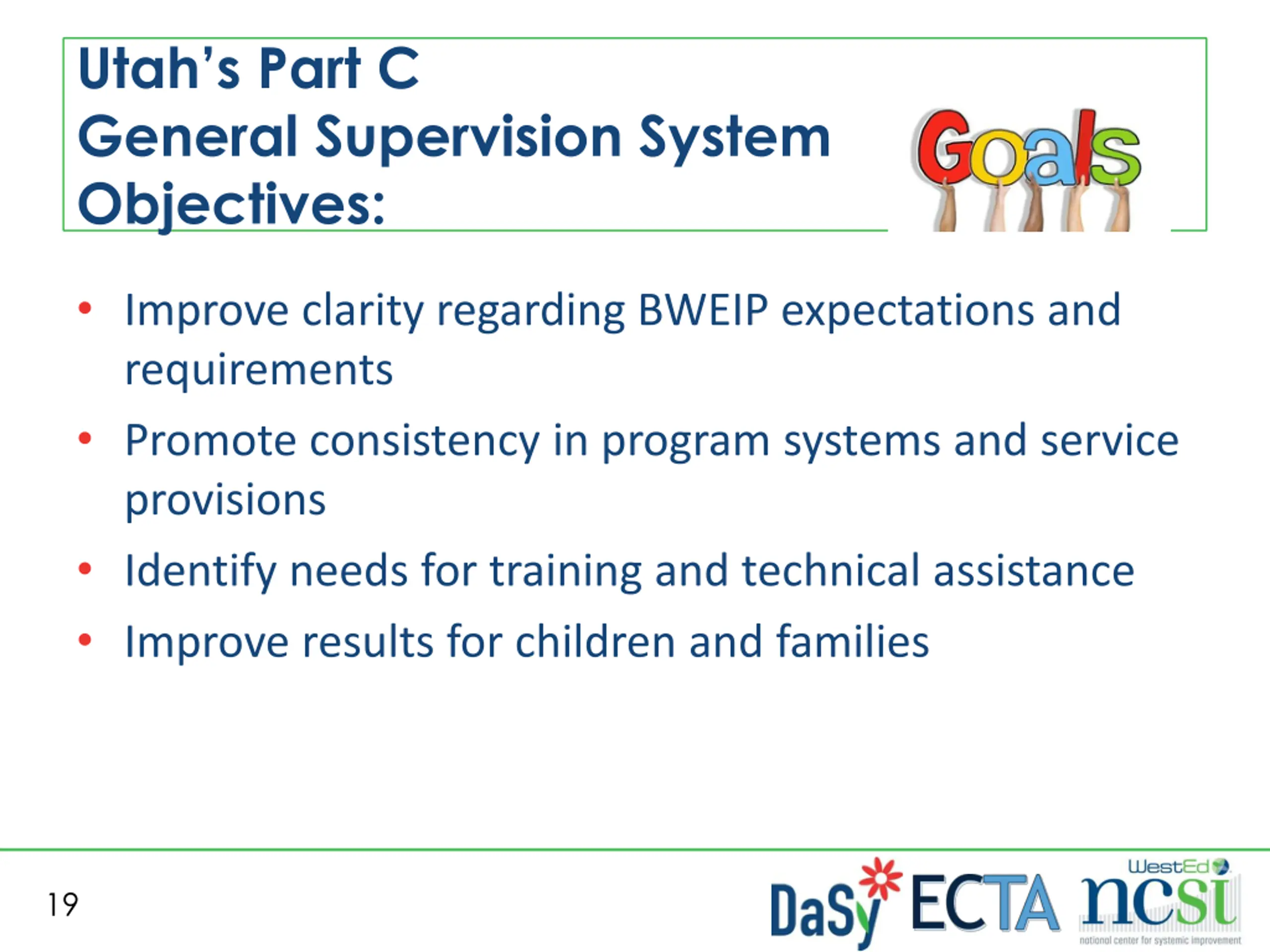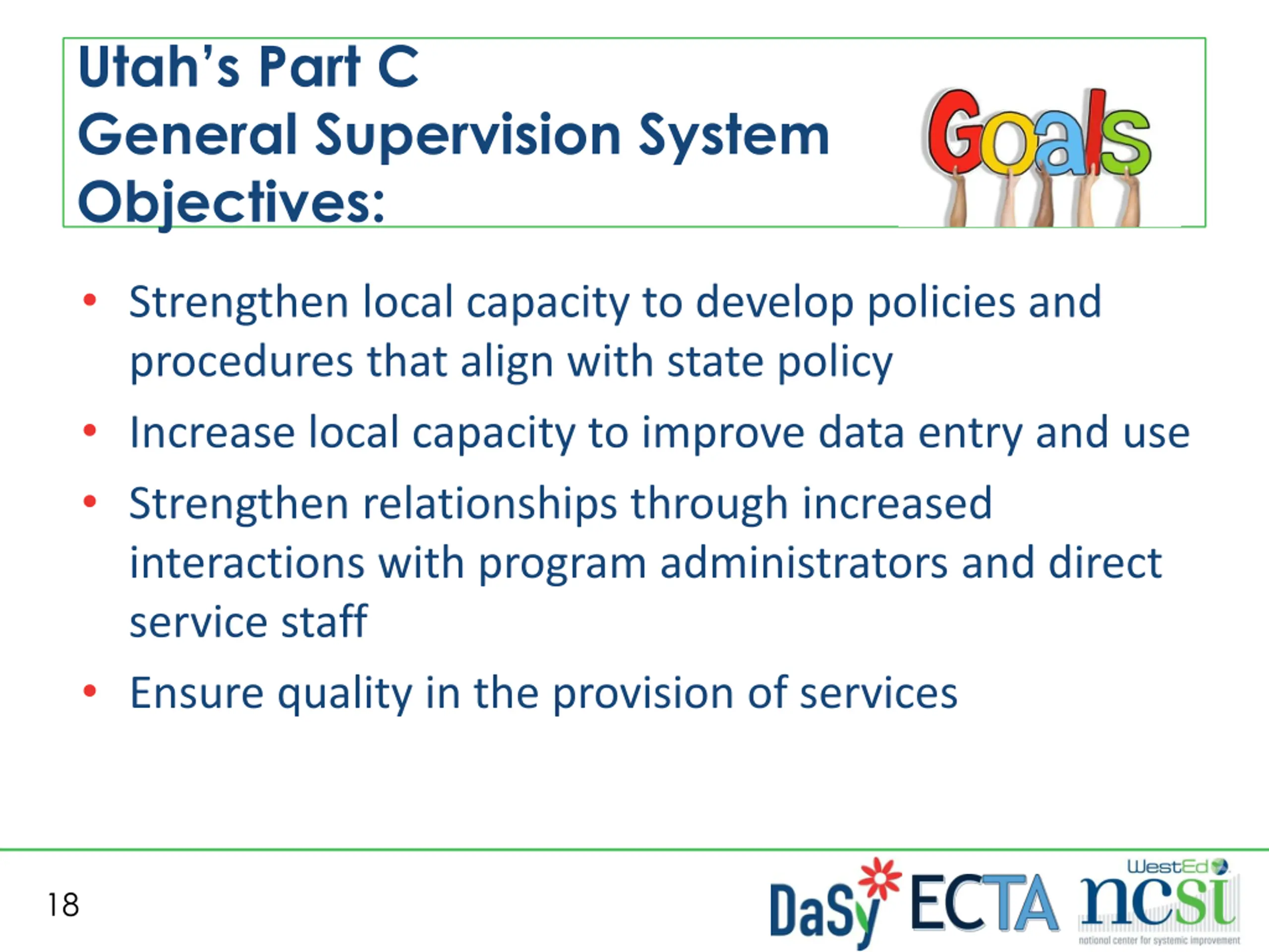 Utahs Part C General Supervision System Objectives: Strengthen local capacity to develop policies and procedures that align with state policy Increase local capacity to improve data entry and use Strengthen relationships through increased interactions with program administrators and direct service staff Ensure quality in the provision of services 18