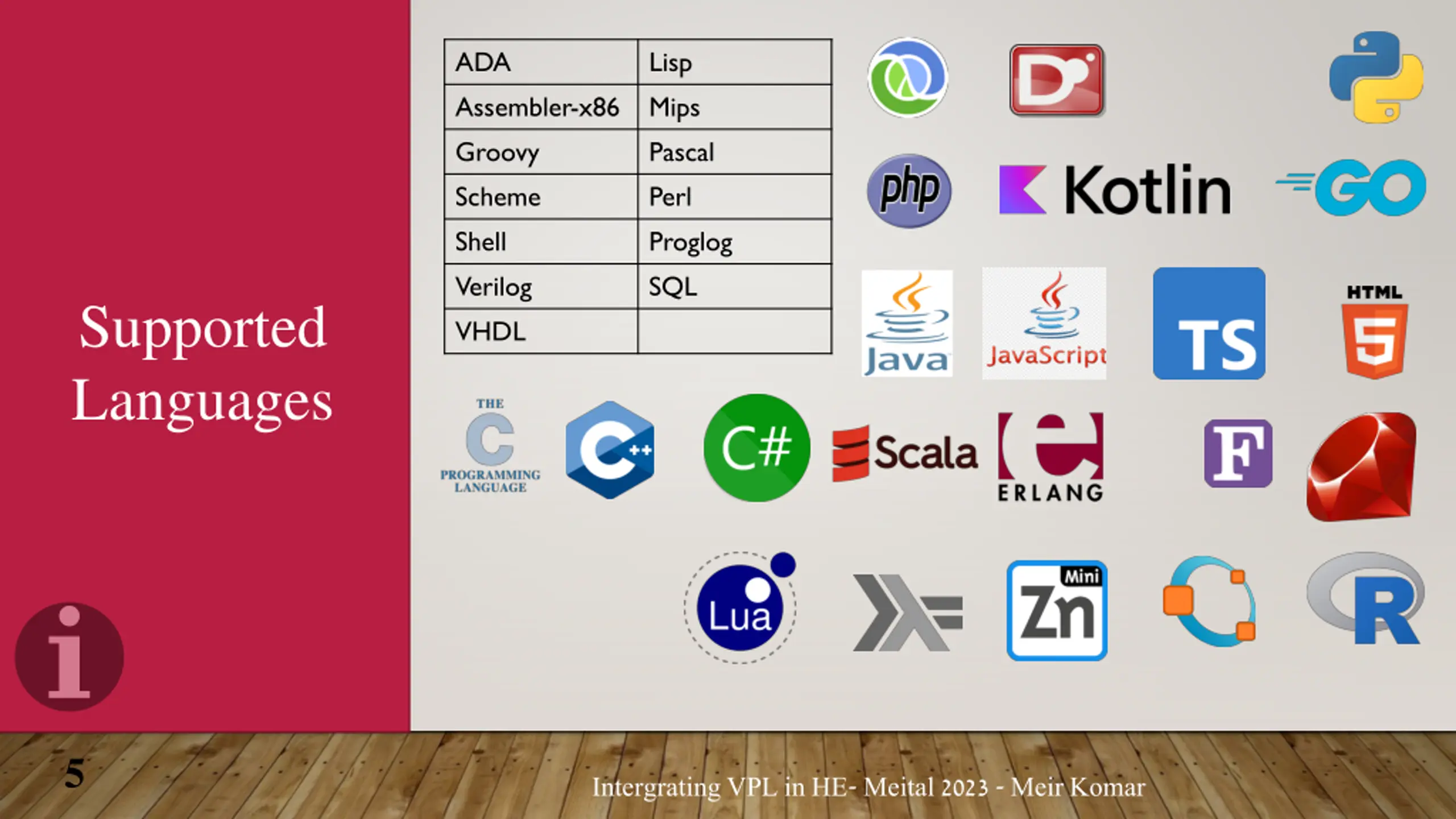 ADA Assembler-x86 Groovy Scheme Shell Verilog VHDL Lisp Mips Pascal Perl Proglog SQL Supported Languages 5 Intergrating VPL in HE- Meital 2023 - Meir Komar