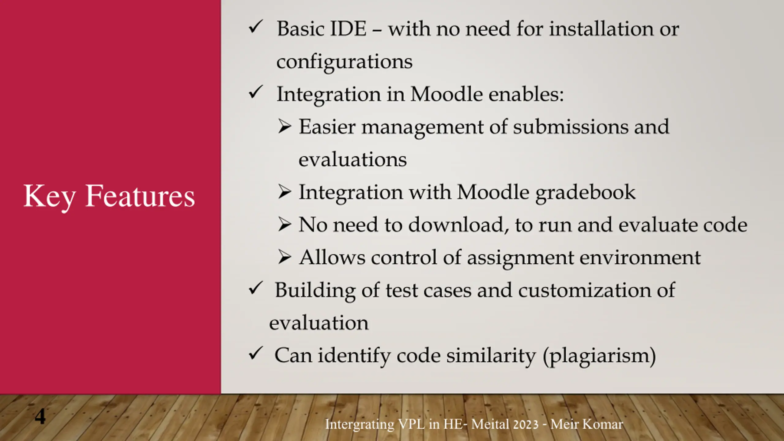 Basic IDE with no need for installation or configurations Integration in Moodle enables: Easier management of submissions and evaluations Integration with Moodle gradebook No need to download, to run and evaluate code Allows control of assignment environment Building of test cases and customization of evaluation Can identify code similarity (plagiarism) Key Features 4 Intergrating VPL in HE- Meital 2023 - Meir Komar