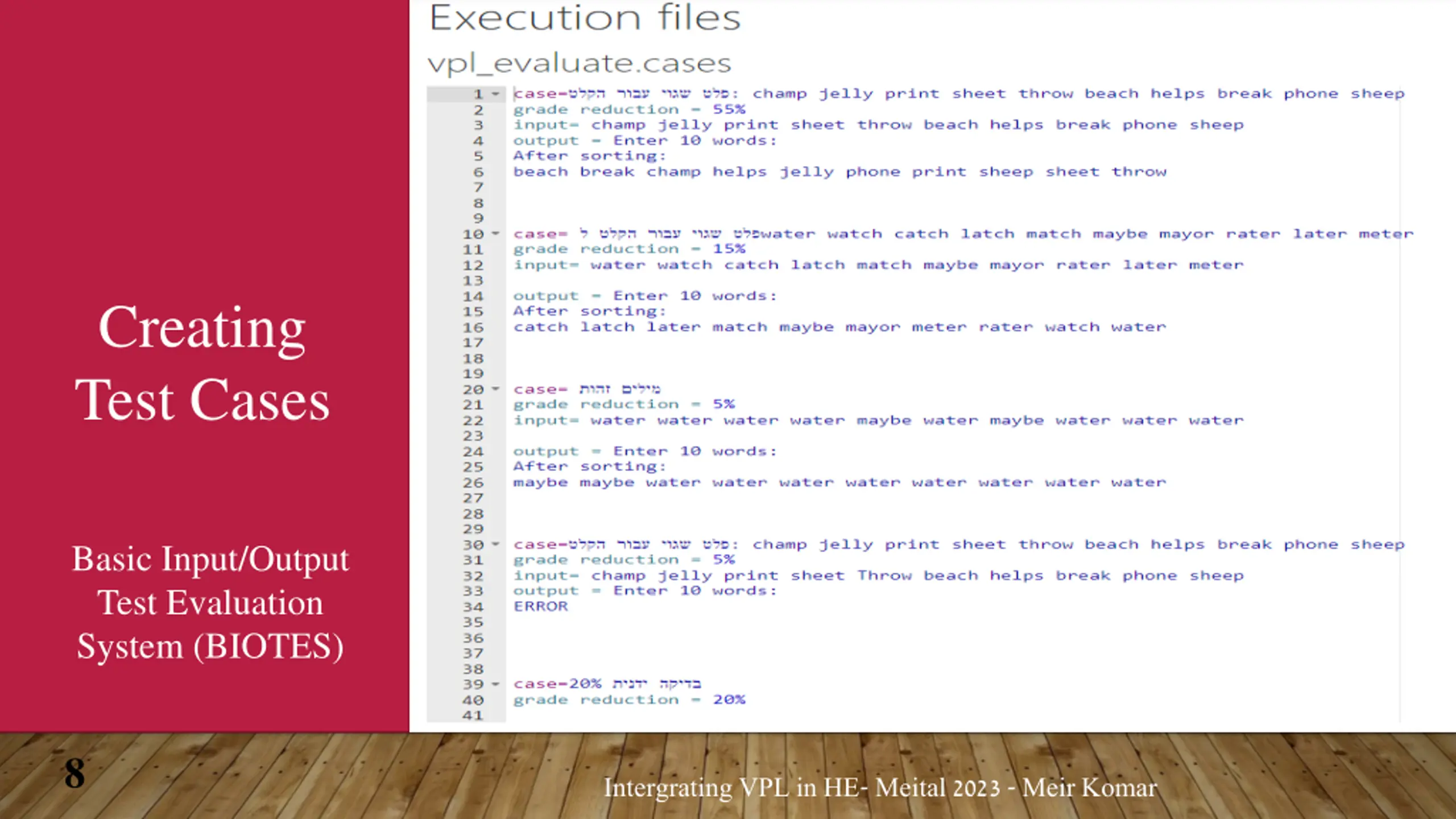 Create a new VPL activity Set name and description Set deadline Basic setup of an activity Set max # of files that can be uploaded Set max grade Save the activity Set the execution actions (options) 7 Intergrating VPL in HE- Meital 2023 - Meir Komar