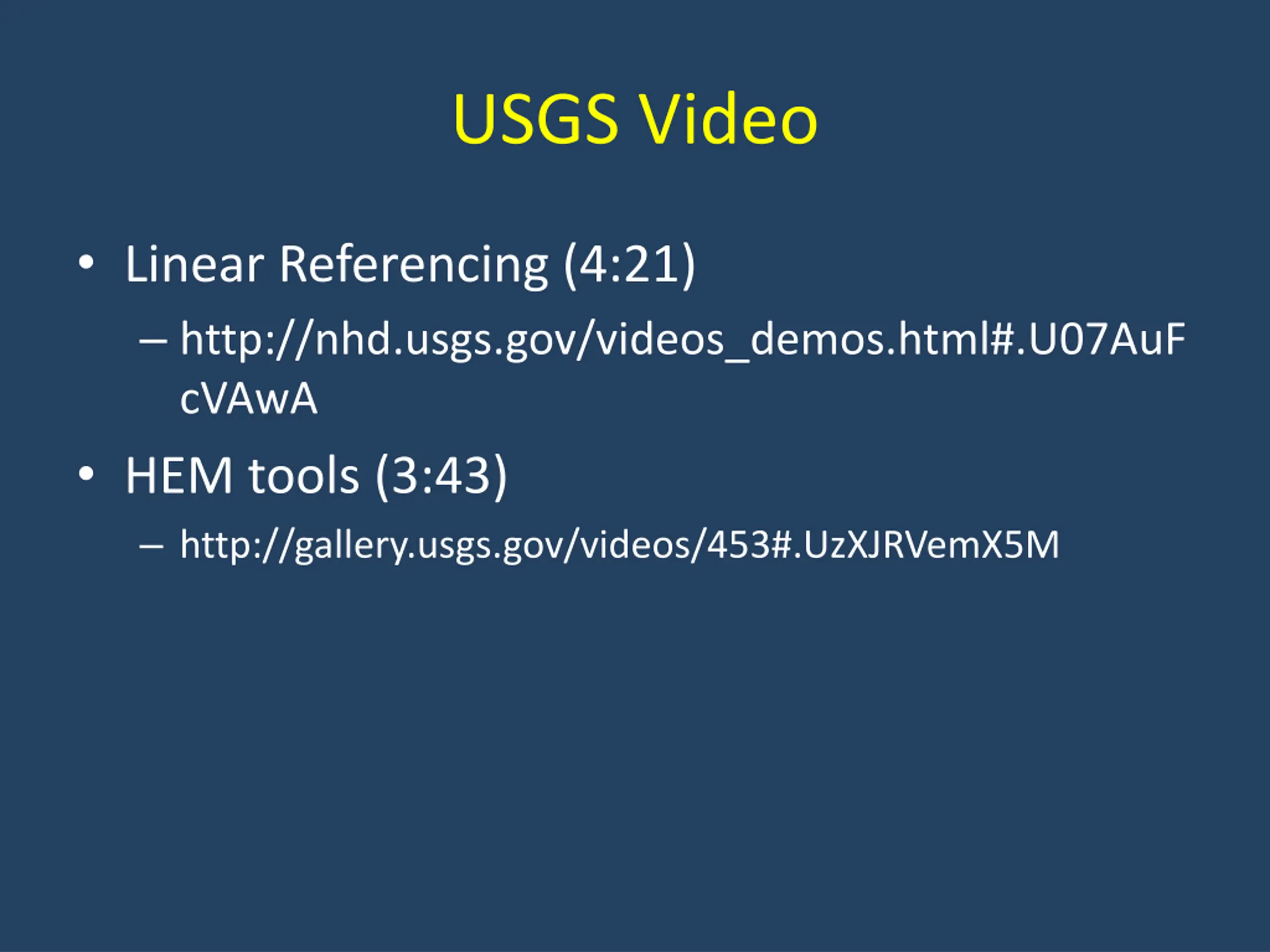 USGS Video Linear Referencing (4:21) http://nhd.usgs.gov/videos_demos.html#.U07AuF cVAwA HEM tools (3:43) http://gallery.usgs.gov/videos/453#.UzXJRVemX5M