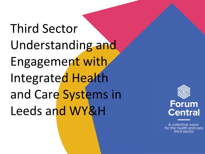 Context A significant re-organisation of the health system Moving extremely quickly and appears to be at a critical point. Offers key opportunities and threats for the third sector. Forum Central, as health and care infrastructure organisation is leading work to secure best outcome for the third sector. Secured our place in the Integrated Care Partnership and recognition that diversity of individual organisations can sign up to the partnership through Forum Central. Third sector representation and engagement at both Primary Care / Local Care Partnership level through Forum Central and at WY&H level through Harnessing the Power of Communities (HPoC)