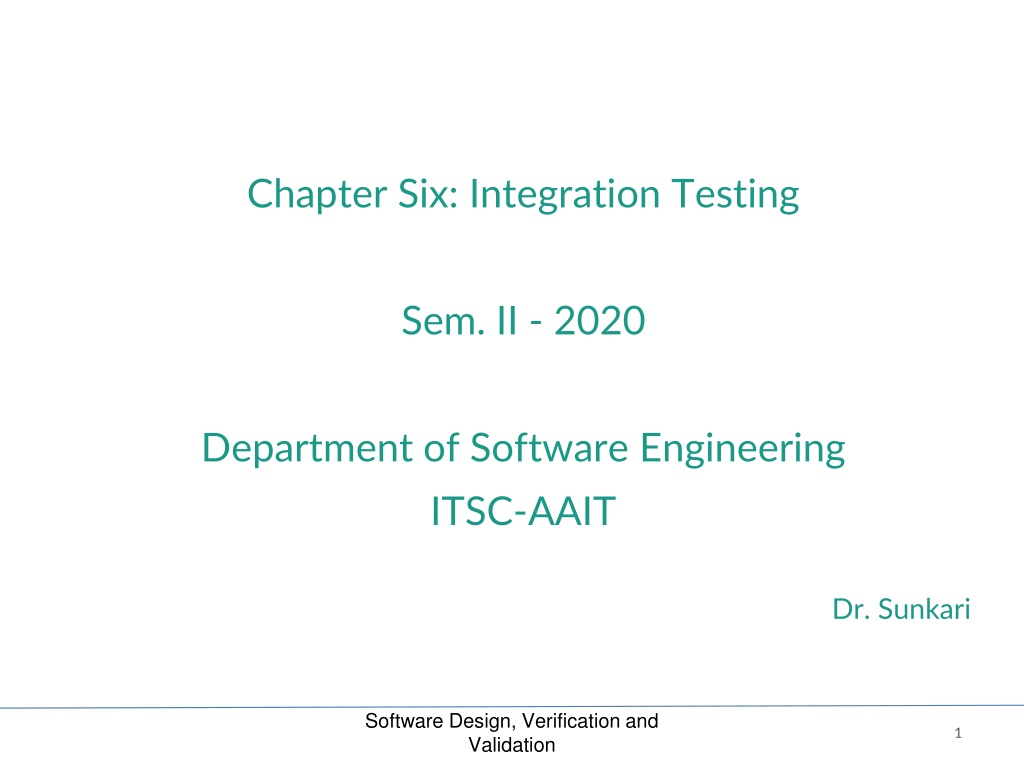 Chapter Six: Integration Testing Sem. II - 2020 Department of Software Engineering ITSC-AAIT Dr. Sunkari Software Design, Verification and Validation 1