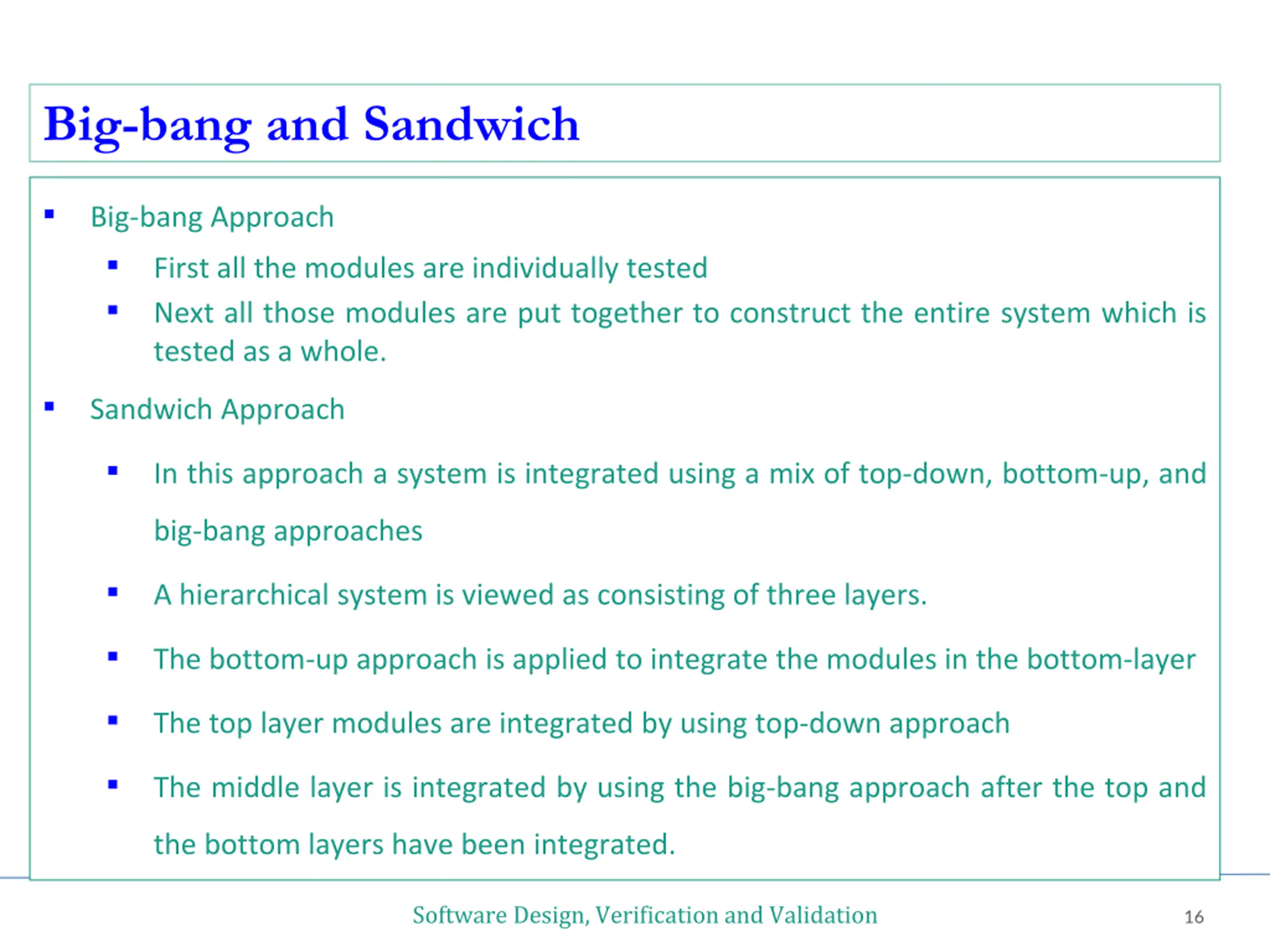 Big-bang and Sandwich Big-bang Approach First all the modules are individually tested Next all those modules are put together to construct the entire system which is tested as a whole. Sandwich Approach In this approach a system is integrated using a mix of top-down, bottom-up, and big-bang approaches A hierarchical system is viewed as consisting of three layers. The bottom-up approach is applied to integrate the modules in the bottom-layer The top layer modules are integrated by using top-down approach The middle layer is integrated by using the big-bang approach after the top and the bottom layers have been integrated. Software Design, Verification and Validation 16