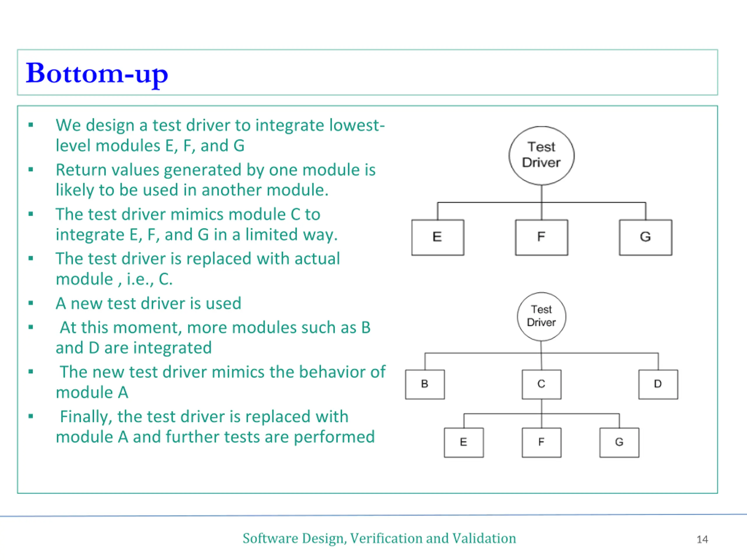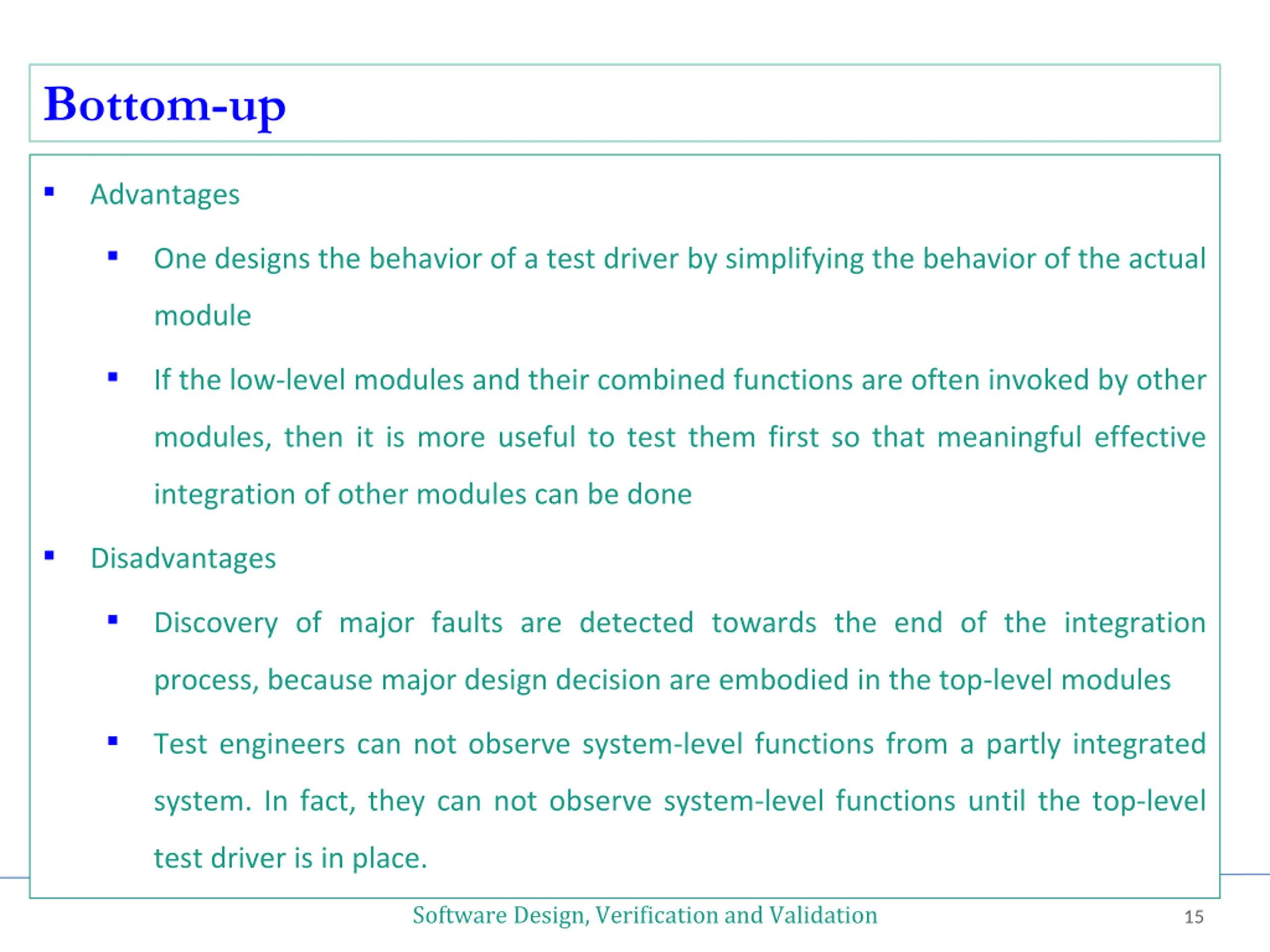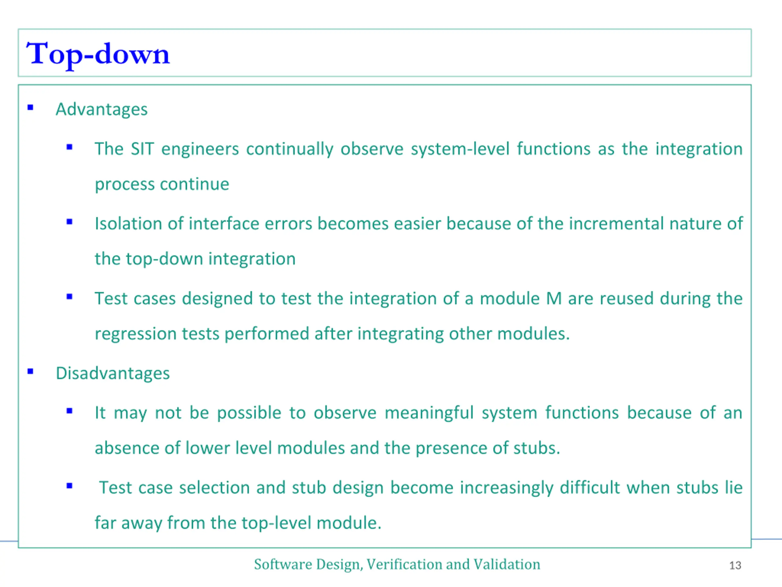 Top-down Advantages The SIT engineers continually observe system-level functions as the integration process continue Isolation of interface errors becomes easier because of the incremental nature of the top-down integration Test cases designed to test the integration of a module M are reused during the regression tests performed after integrating other modules. Disadvantages It may not be possible to observe meaningful system functions because of an absence of lower level modules and the presence of stubs. Test case selection and stub design become increasingly difficult when stubs lie far away from the top-level module. Software Design, Verification and Validation 13
