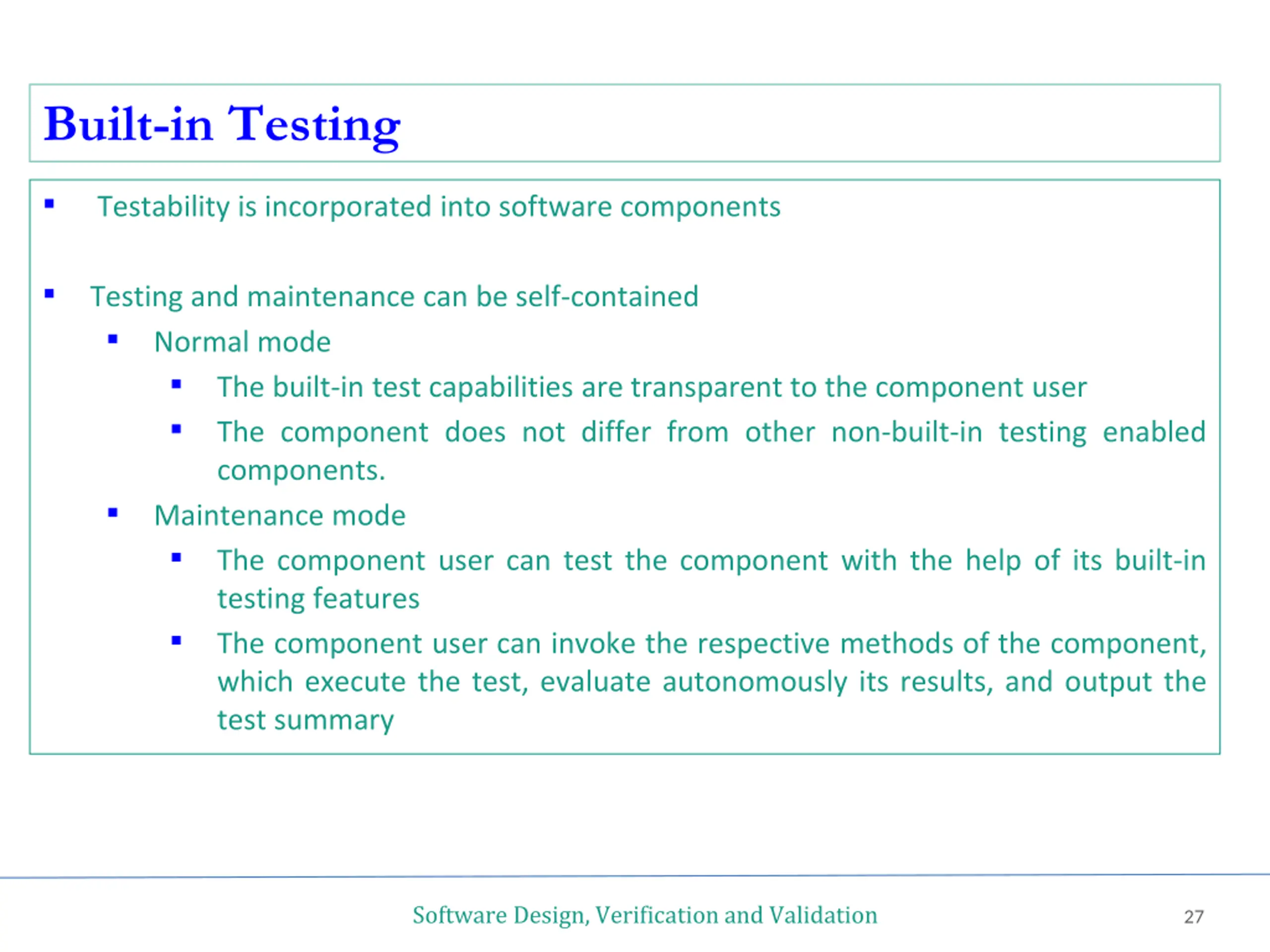 Built-in Testing Testability is incorporated into software components Testing and maintenance can be self-contained Normal mode The built-in test capabilities are transparent to the component user The component does not differ from other non-built-in testing enabled components. Maintenance mode The component user can test the component with the help of its built-in testing features The component user can invoke the respective methods of the component, which execute the test, evaluate autonomously its results, and output the test summary Software Design, Verification and Validation 27