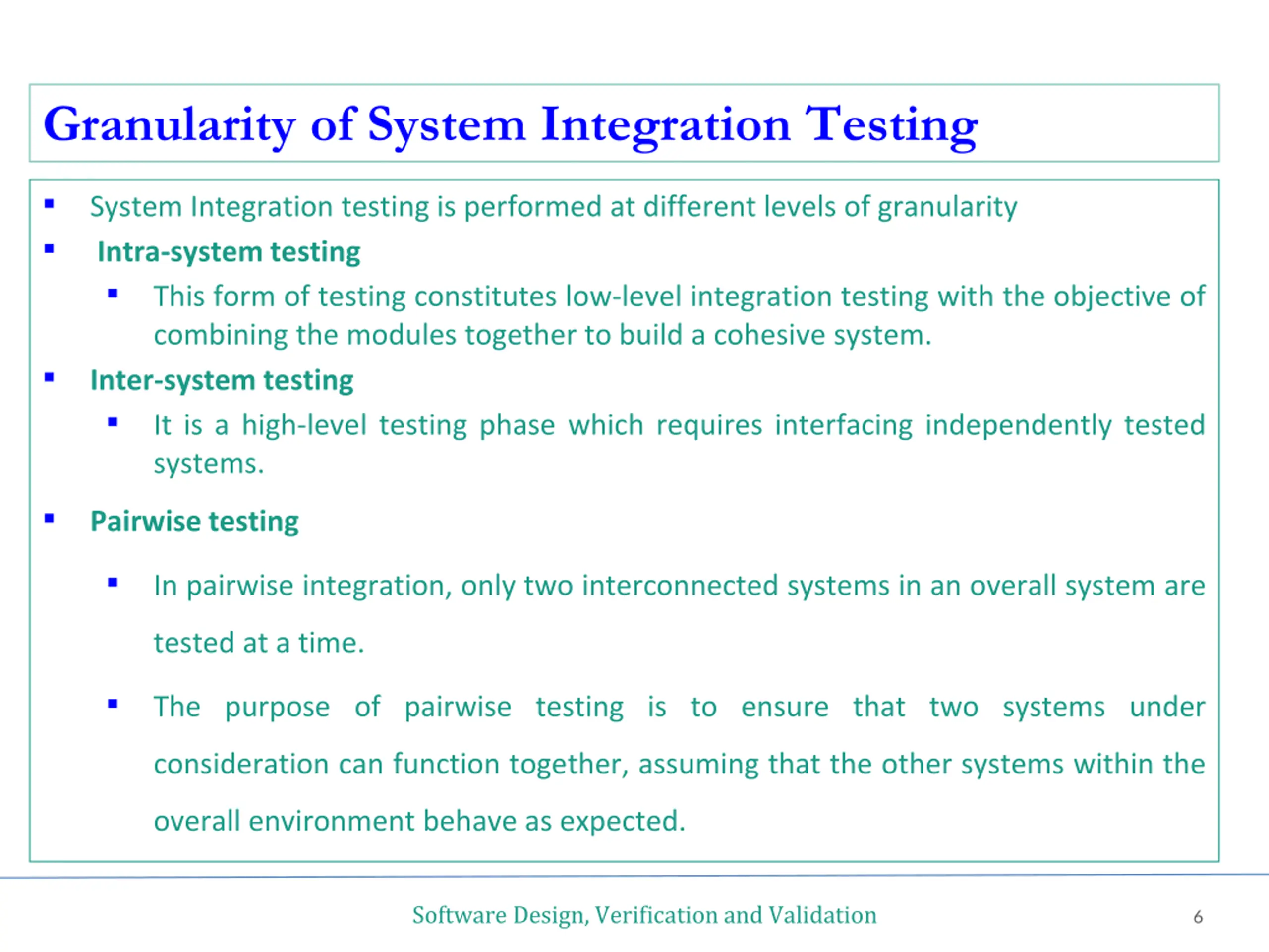 Granularity of System Integration Testing System Integration testing is performed at different levels of granularity Intra-system testing This form of testing constitutes low-level integration testing with the objective of combining the modules together to build a cohesive system. Inter-system testing It is a high-level testing phase which requires interfacing independently tested systems. Pairwise testing In pairwise integration, only two interconnected systems in an overall system are tested at a time. The purpose of pairwise testing is to ensure that two systems under consideration can function together, assuming that the other systems within the overall environment behave as expected. Software Design, Verification and Validation 6
