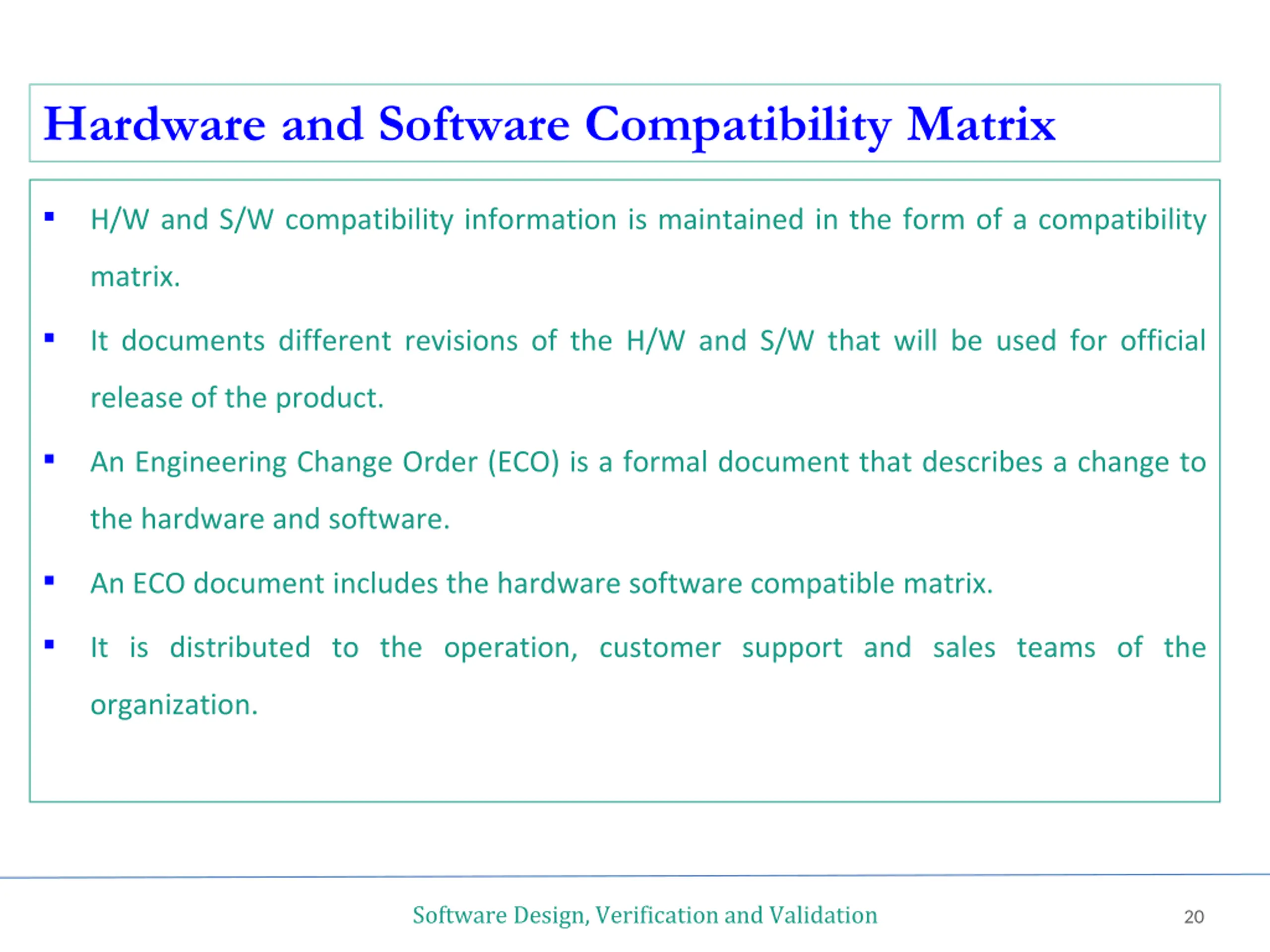 Hardware and Software Compatibility Matrix H/W and S/W compatibility information is maintained in the form of a compatibility matrix. It documents different revisions of the H/W and S/W that will be used for official release of the product. An Engineering Change Order (ECO) is a formal document that describes a change to the hardware and software. An ECO document includes the hardware software compatible matrix. It is distributed to the operation, customer support and sales teams of the organization. Software Design, Verification and Validation 20