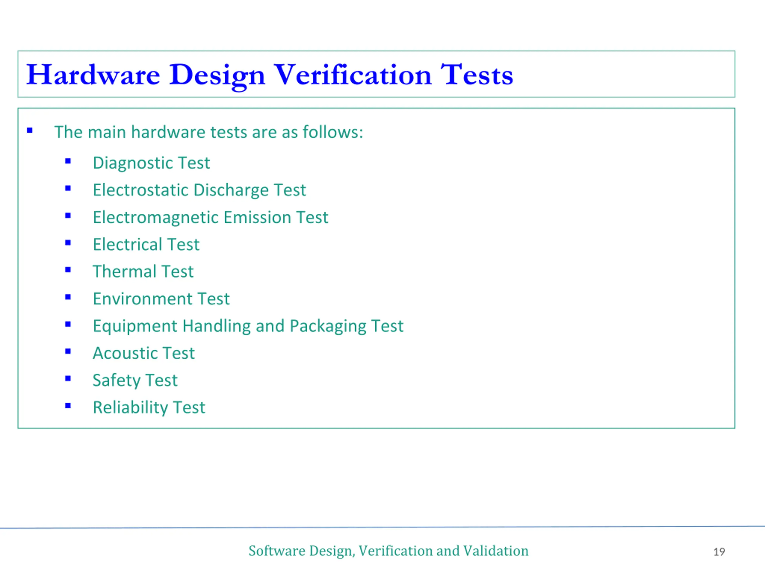 Hardware Design Verification Tests The main hardware tests are as follows: Diagnostic Test Electrostatic Discharge Test Electromagnetic Emission Test Electrical Test Thermal Test Environment Test Equipment Handling and Packaging Test Acoustic Test Safety Test Reliability Test Software Design, Verification and Validation 19