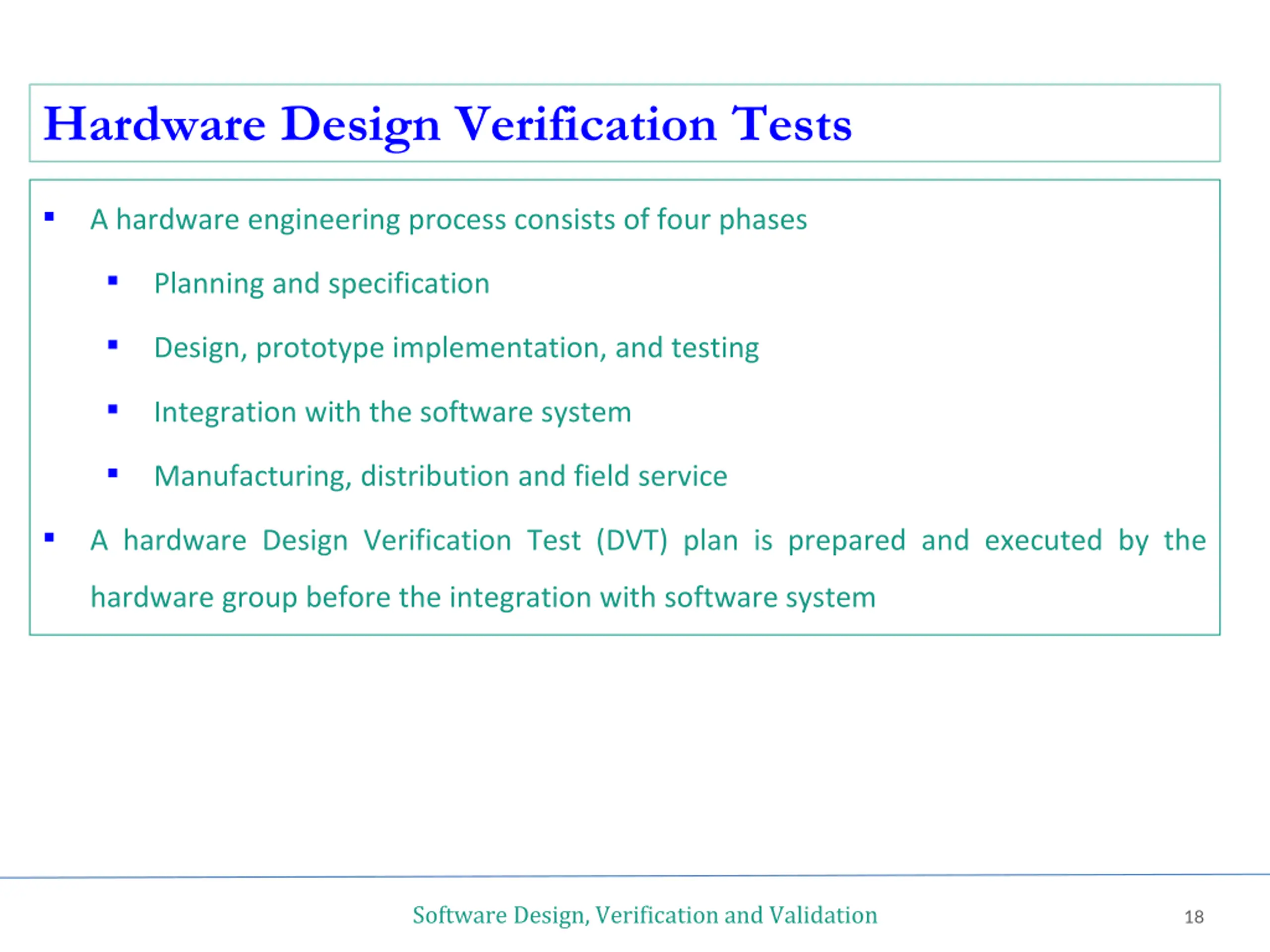 Hardware Design Verification Tests A hardware engineering process consists of four phases Planning and specification Design, prototype implementation, and testing Integration with the software system Manufacturing, distribution and field service A hardware Design Verification Test (DVT) plan is prepared and executed by the hardware group before the integration with software system Software Design, Verification and Validation 18